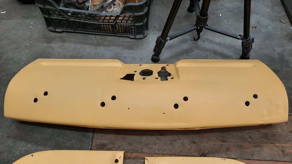 Pas górny nie miał otwórów na emblematy - to wyszło dopiero po zdjęciu szpachli. Oprócz tego jest pognieciony. Wycięcia na zamek maski są robione przez Kubę Rozpruwacza albo coś, bo są krzywe, niechlujne i za duże.