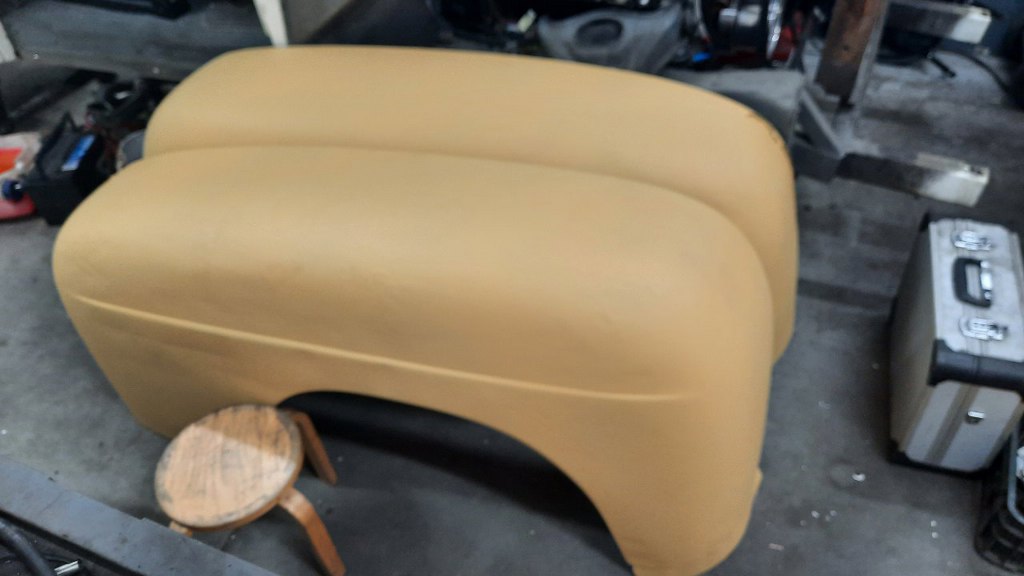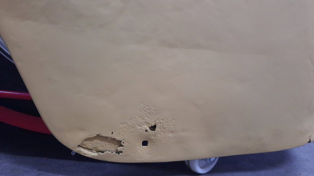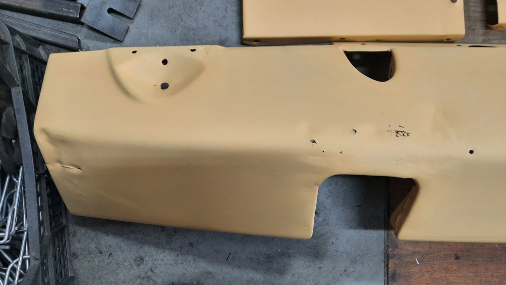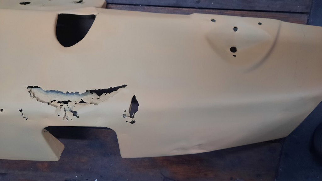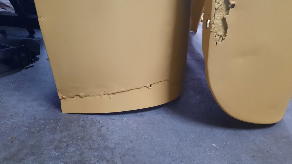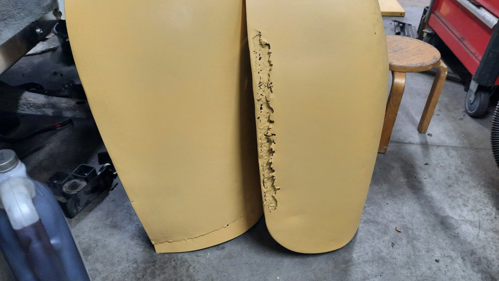 Tyły niby ok, ale brakuje w nich dolnej krawędzi, która kiedyś była odcięta i zastąpiona kawałkiem blaszki. Dość nierównej i złapanej kilkoma spawami... Całość była pogrzebana pod TRZYCENTYMETROWĄ warstwą szpachli.