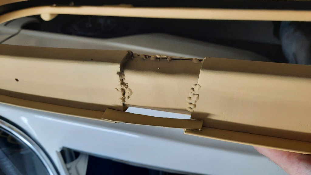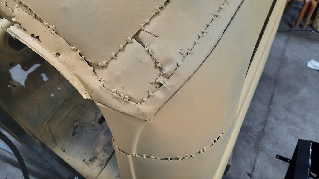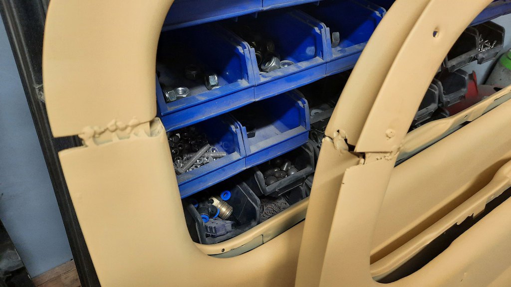 W górnej części drzwi są jakoś połączone, ale żeby szpachla miała się do czego trzymać, dospawana była blaszka. Spawy są na tyle kiepskie, że większość z nich nie jest nawet wtopiona w blachę. To wszystko przy jakimś obciążeniu po prostu by się rozerwało.