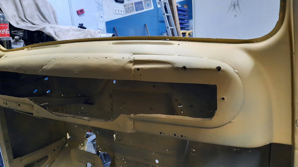 Deska rozdzielcza. Ten customowy panel był wstawiony dość na chama, widać jak wyrżnięte są blachy. Ale najciekawsze jest to, że tu był kiedyś schowek, który został zaspawany i wycięty.