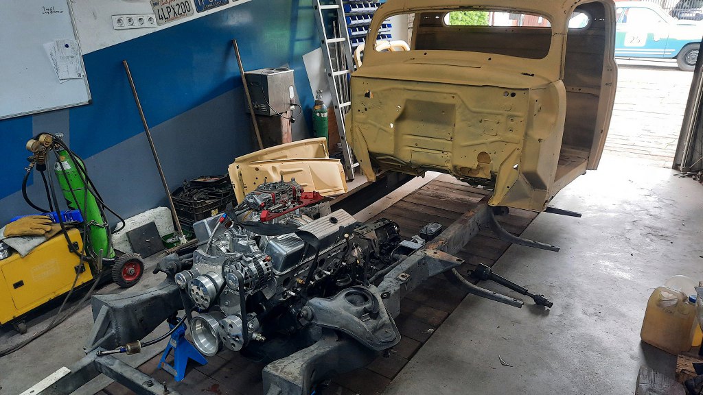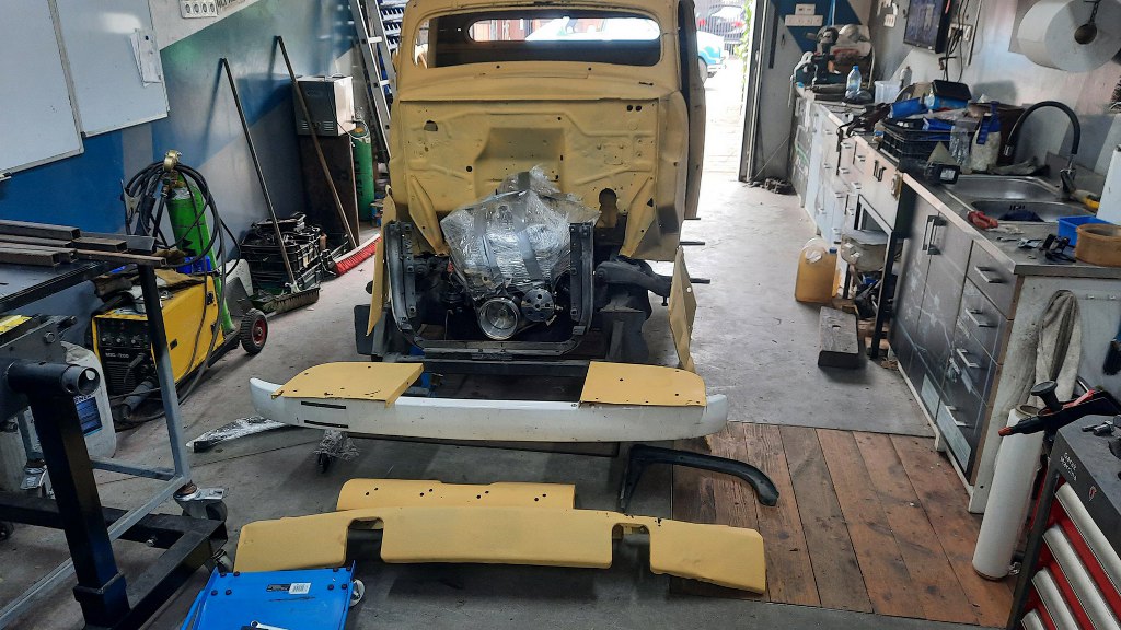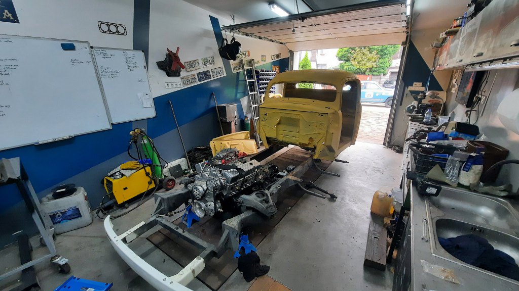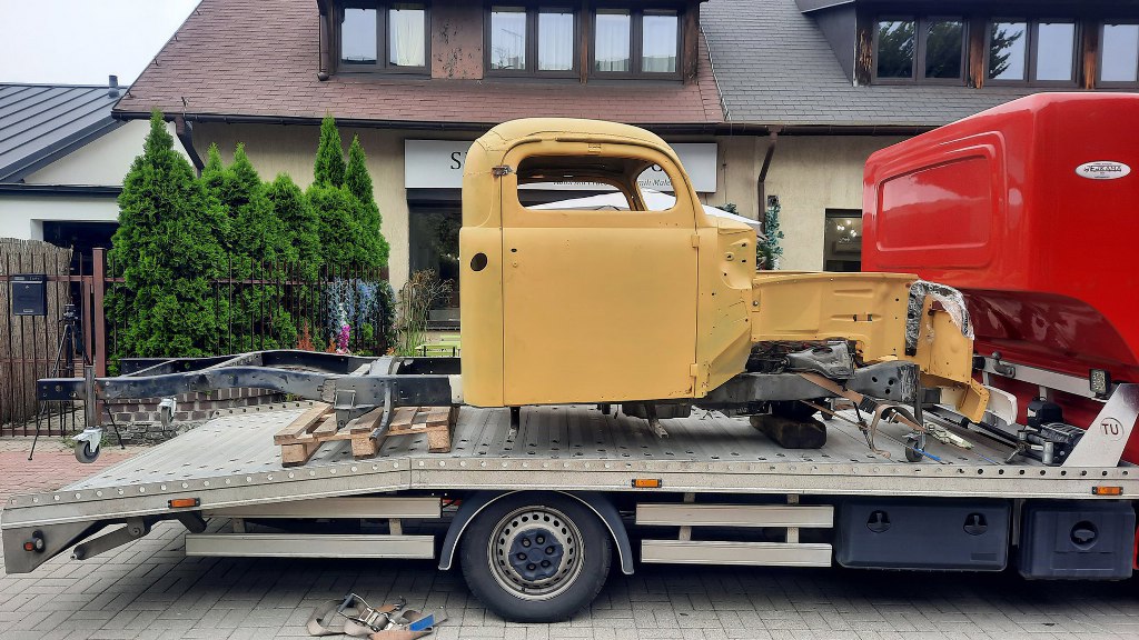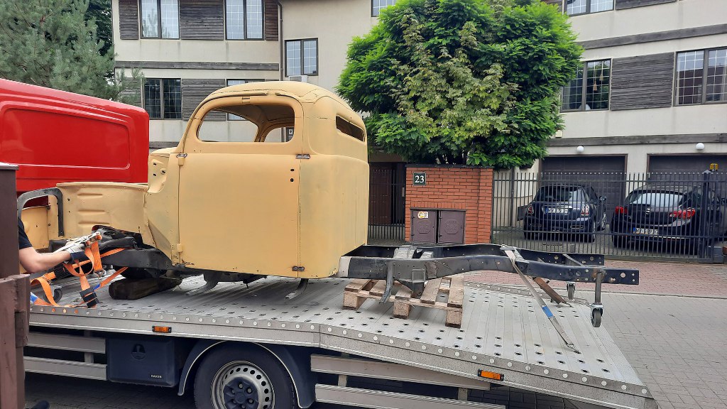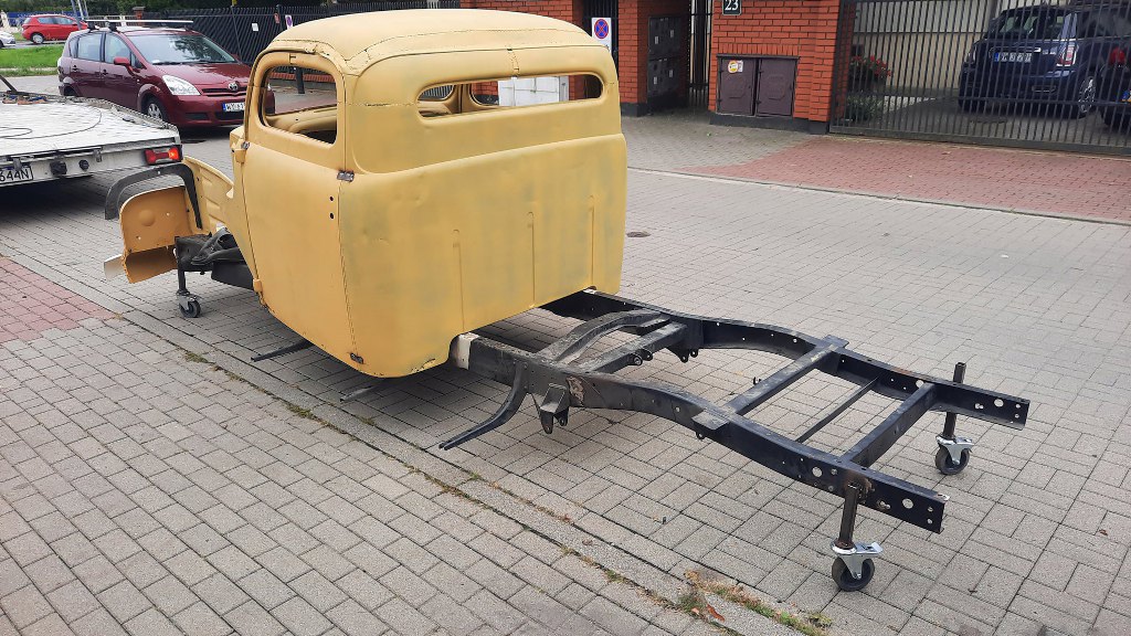 Czyli przede mną proste zadanie - przygotować pierwszą partię części do wywiezienia do blacharki. Ponieważ z kabiny dość mało będzie wykorzystane, to potrzebujemy kilka rzeczy dookoła kabiny, żeby wszystko do siebie pasowało. Czyli potrzebna będzie rama (żeby zrobić mocowania kabiny do niej), silnik i skrzynia (żeby zrobić pod to odpowiednio wyprofilowaną gródź i tunel), mocowanie chłodnicy (bo błotniki wewnętrzne do niej są przykręcone) i tak dalej. Dla ułatwienia mam na to zaledwie kilka godzin, bo dopiero wróciłem z urlopu, a laweta już jedzie. Na szybko zatem wrzuciłem kabinę na ramę - teraz bardzo łatwo się ją nosi... Jest znacznie lżejsza. Potem na miejsce trafił silnik ze skrzynią.