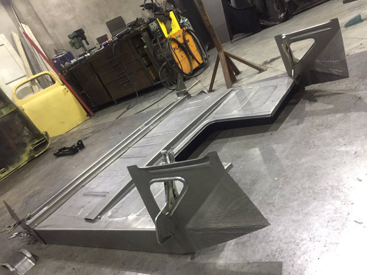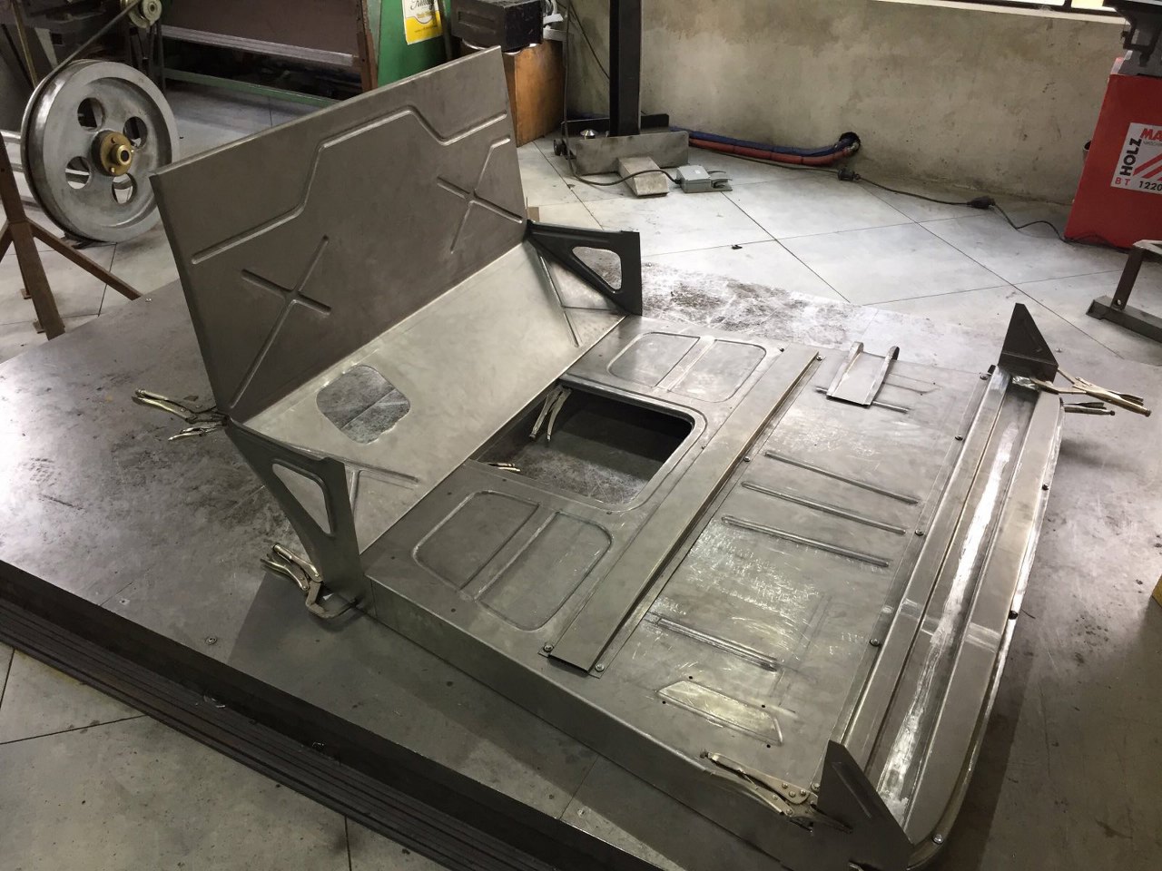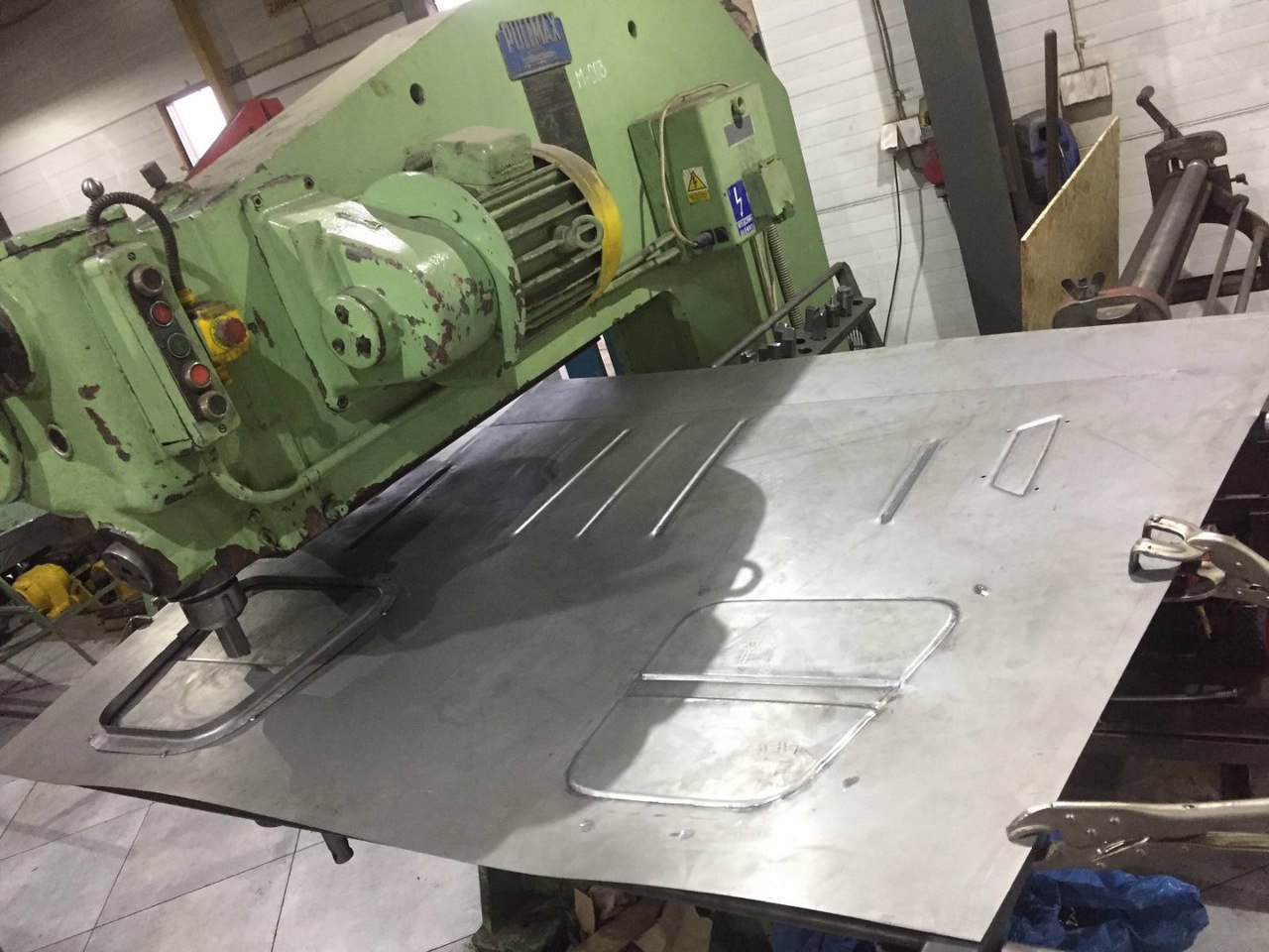 Ponieważ nie bardzo było co zbierać z tej karoserii, trzeba było sporo zbudować od zera. A że samochód jest mocno przerobiony, to i niewiele elementów dostępnych jako reprodukcje tu się przyda. Większość rzeczy zostanie dorobiona z arkusza blachy. Zaczynając od płyty podłogowej.