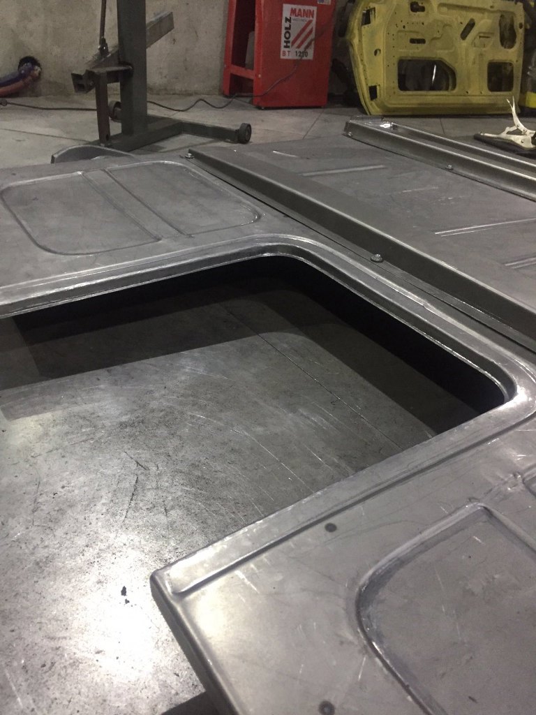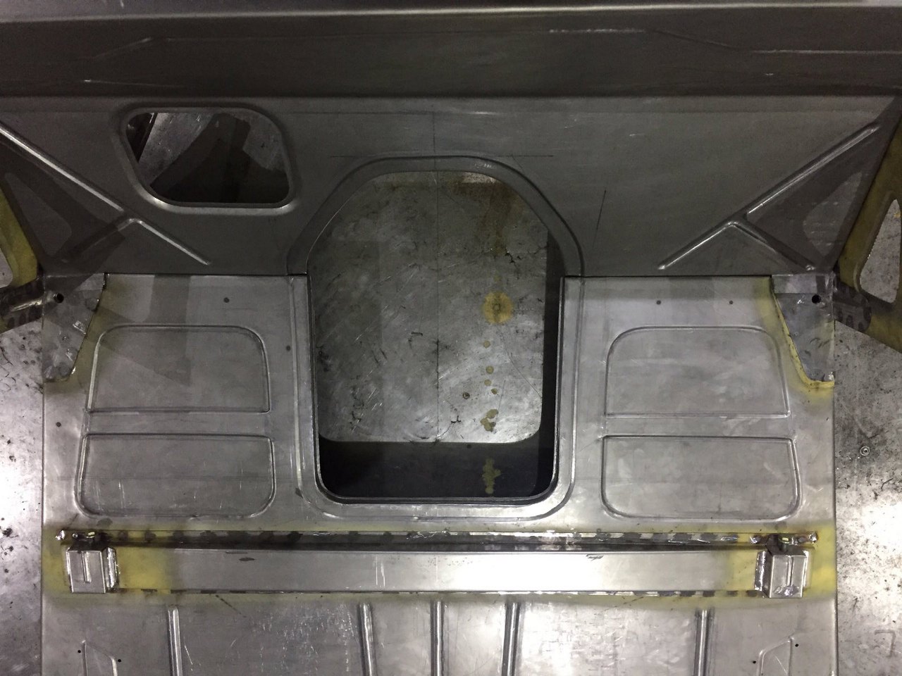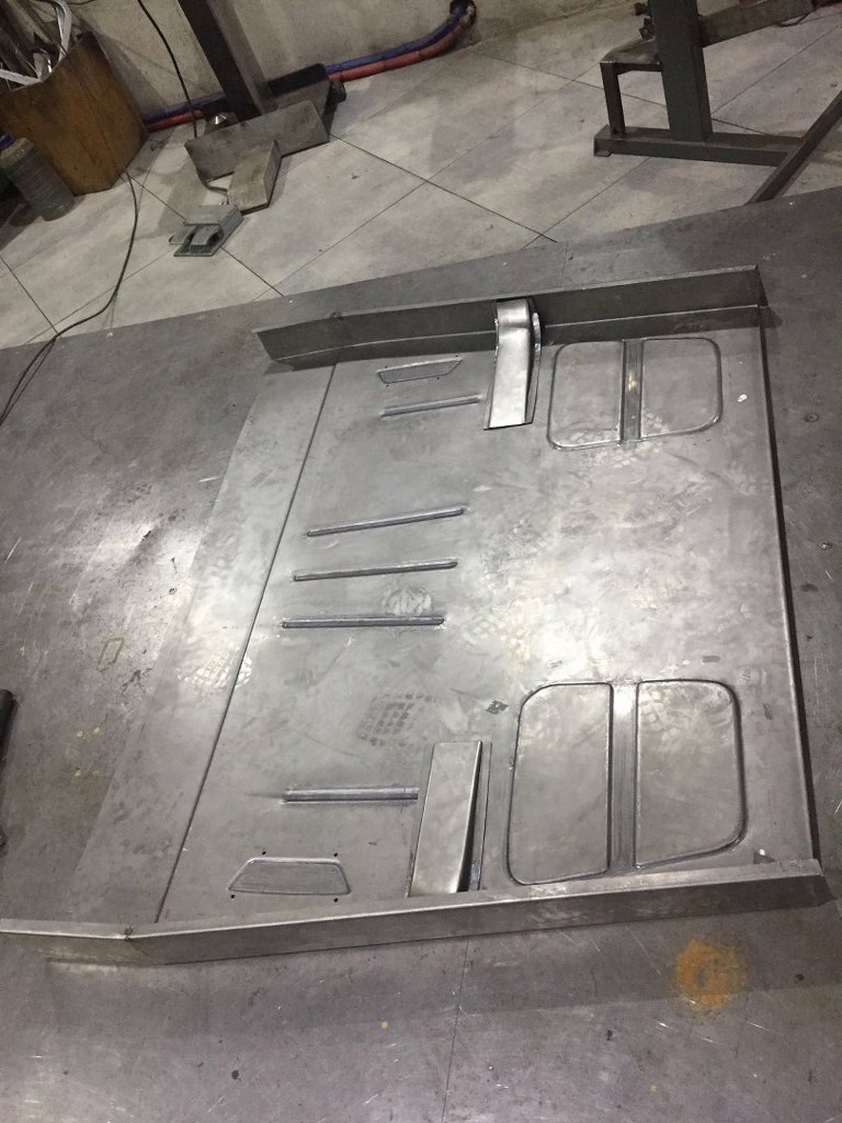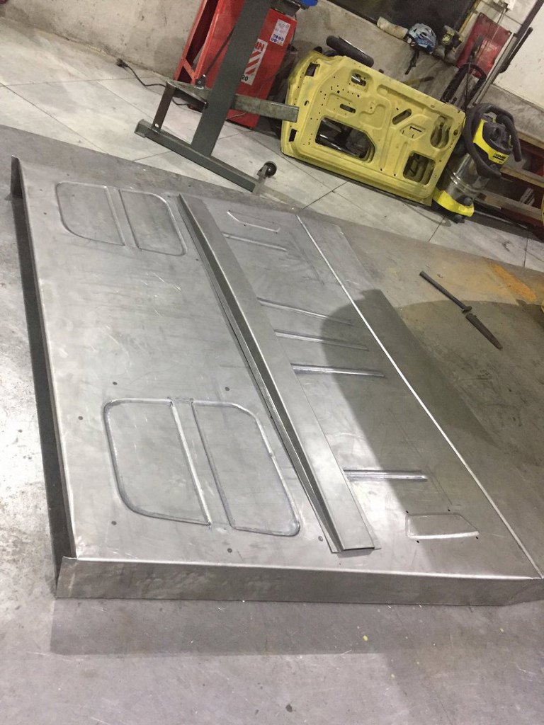 Tu płyta podłogowa już nieco wyprostowana, z wygiętymi w dół bokami jako progi wewnętrzne. Na środku w poprzek wzmocnienie. Wszystko ma trafiać w fabryczne wymiary, wzmocnienia są też w miejscu, gdzie były oryginalnie.