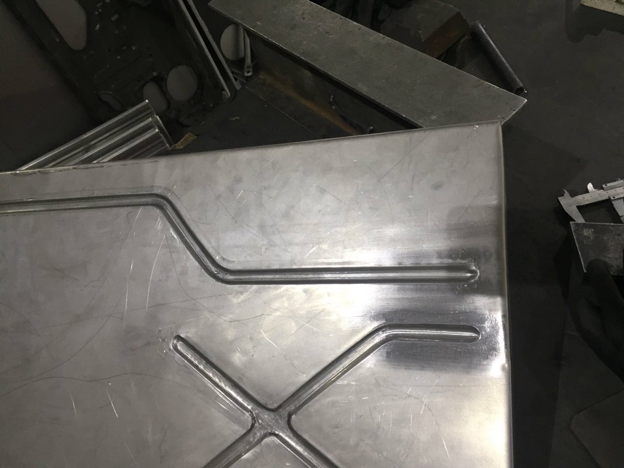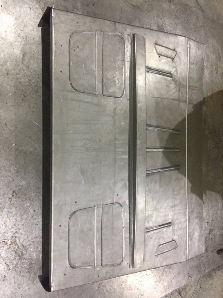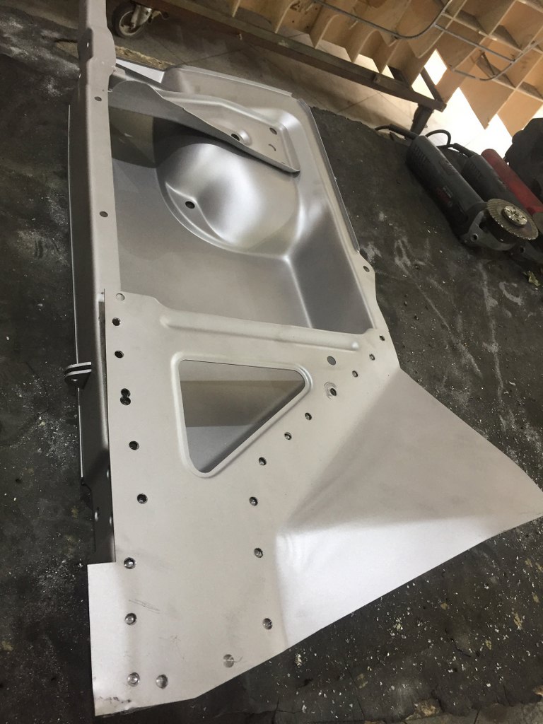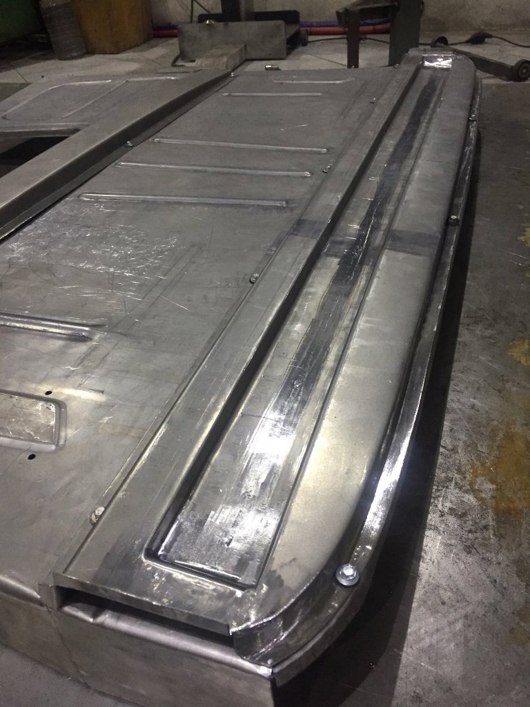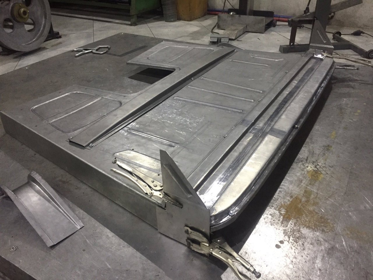 Tu płyta podłogowa już nieco wyprostowana, z wygiętymi w dół bokami jako progi wewnętrzne. Na środku w poprzek wzmocnienie. Wszystko ma trafiać w fabryczne wymiary, wzmocnienia są też w miejscu, gdzie były oryginalnie.