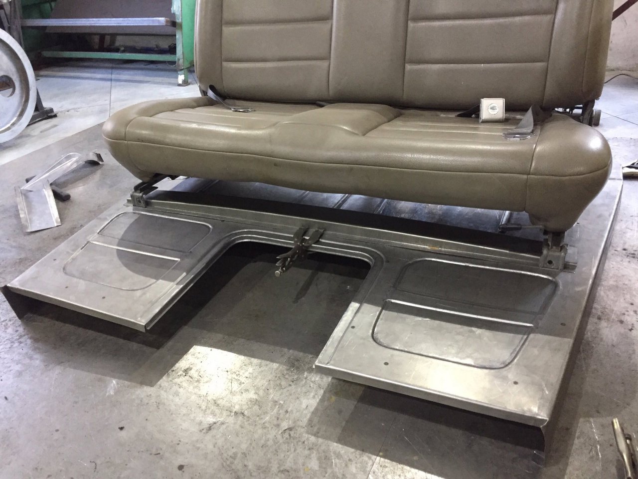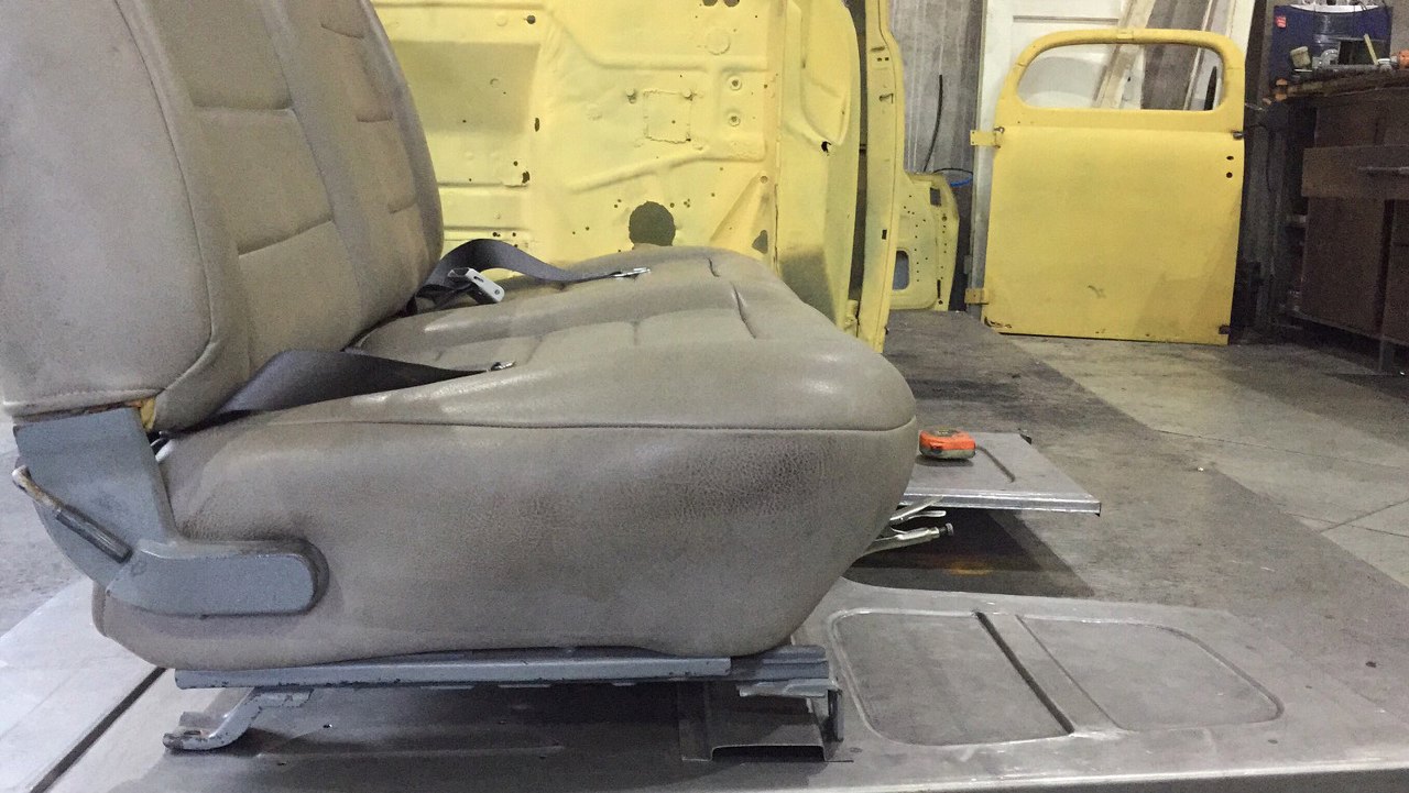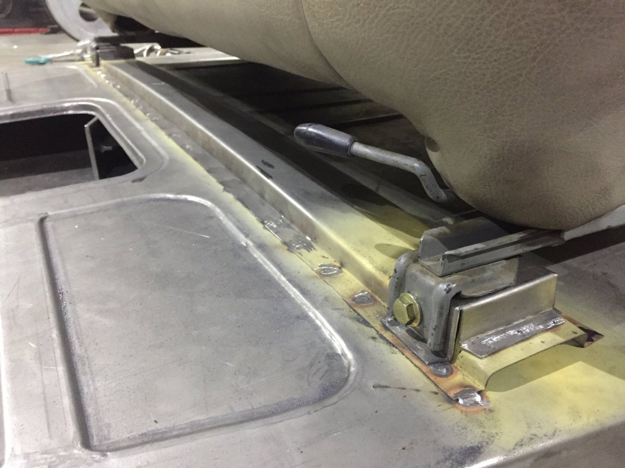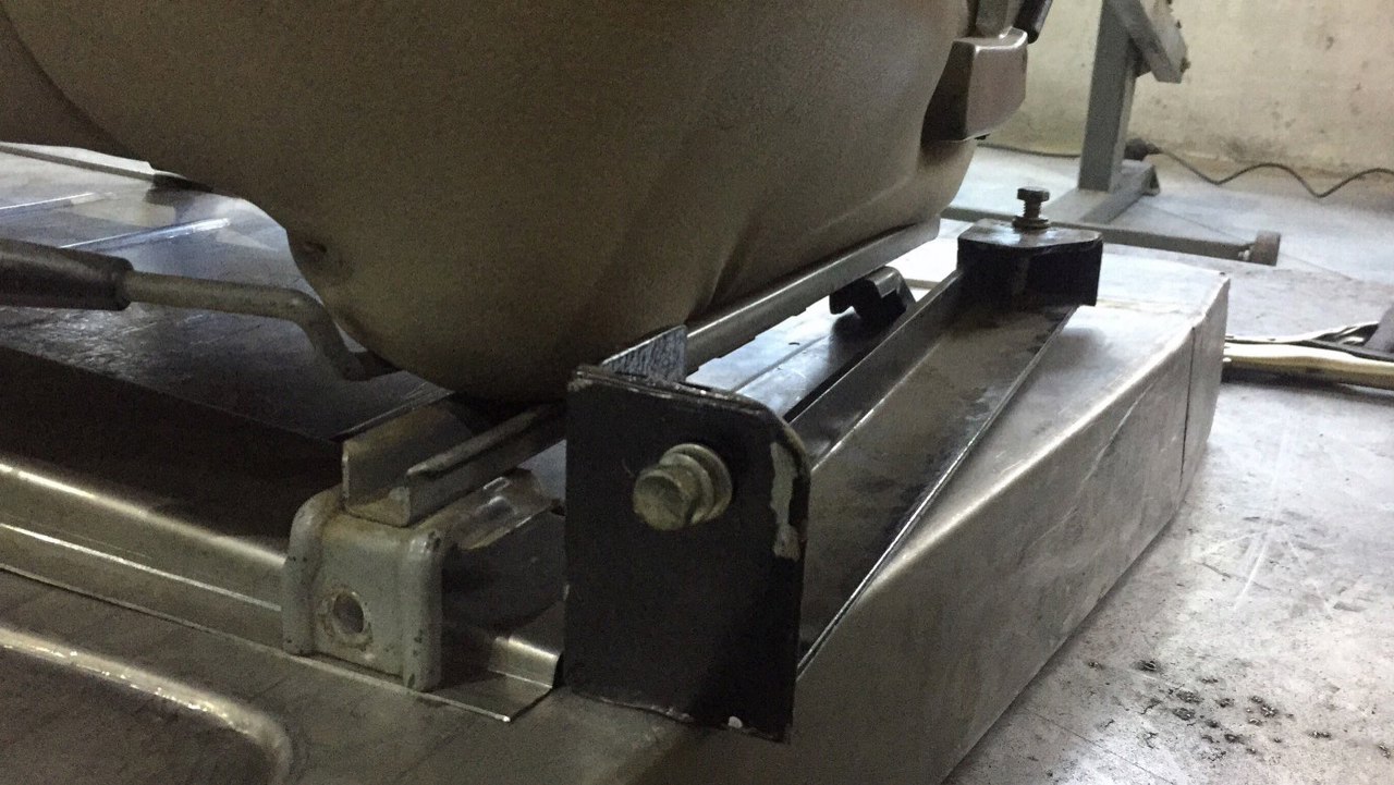 Mocowanie kanapy, w sumie ciut siermiężne, wylatuje. Niby nic z nim nie jest nie tak, ale skoro robimy podłogę od zera, to można to zrobić jako element karoserii. No i ponieważ buda ma obniżony dach, to potrzebujemy wykorzystać każde dostępne miejsce na kierowcę, więc kanapa te 3cm niżej robi różnicę.