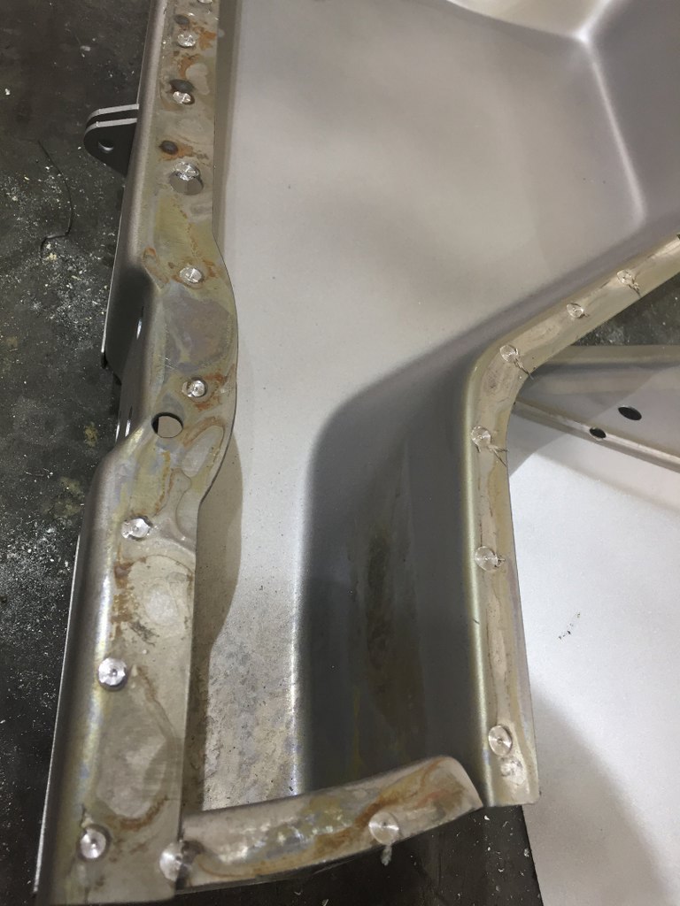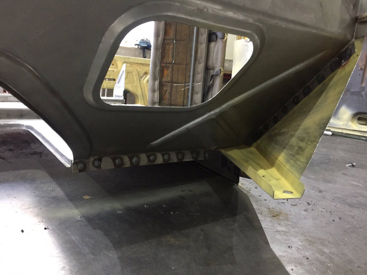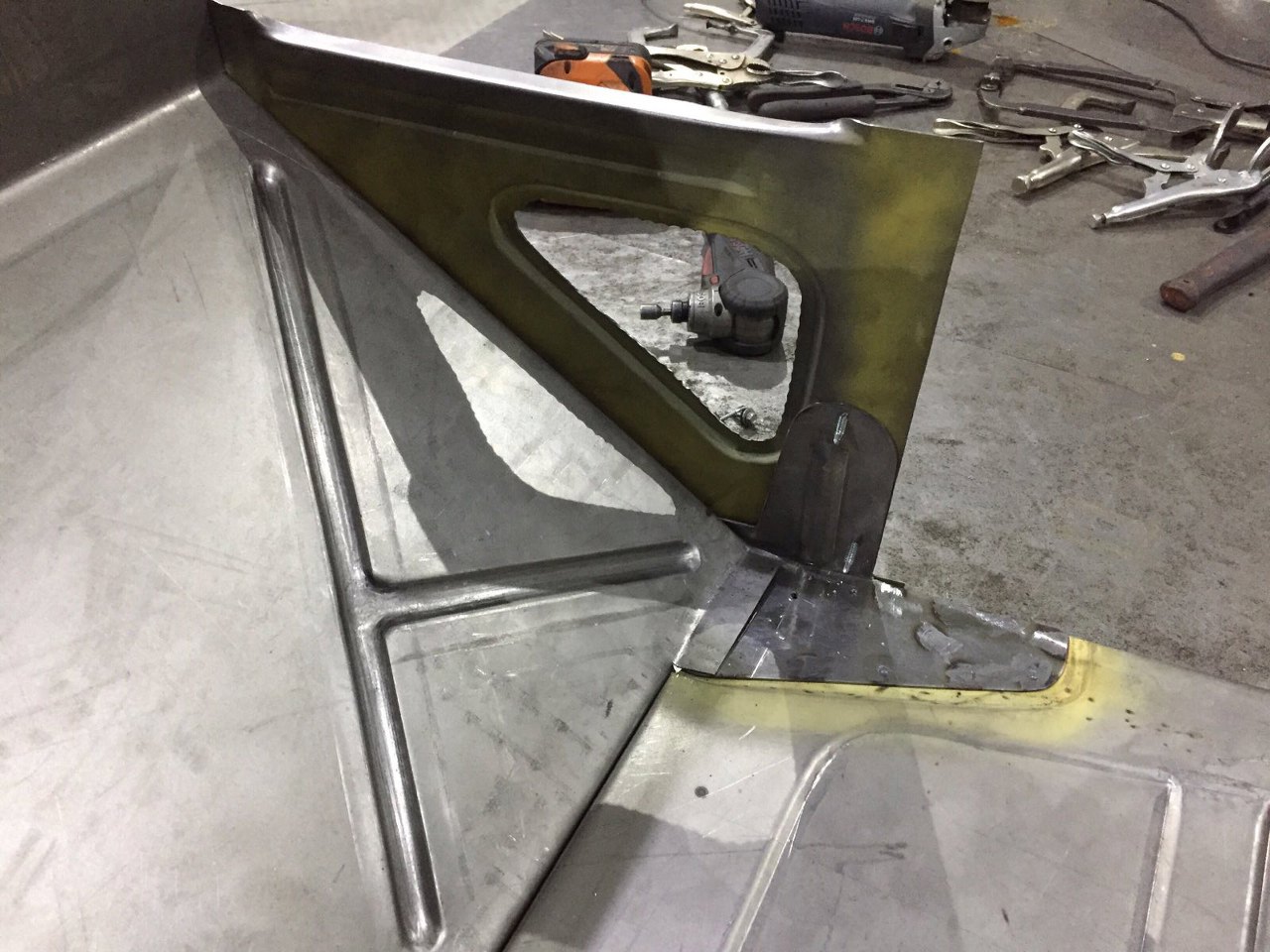 Zbliżenie na przetłoczenia wycięcia na skrzynię biegów. Tu będzie przykręcana pokrywa. Wzmocnienia są przykręcone wkrętami, przyspawane będą ciut później.