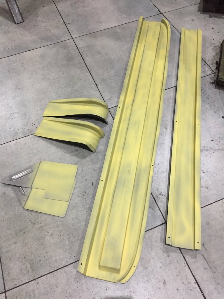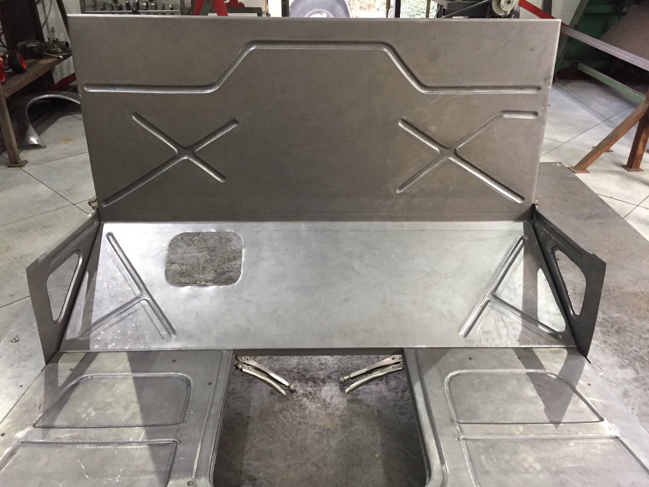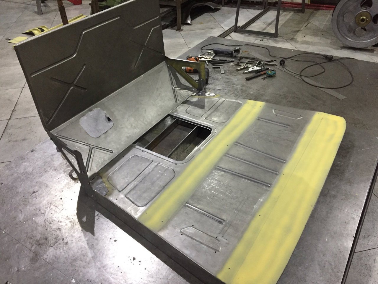 Z przodu pojawiło się wycięcie (z przetłoczeniami) na skrzynię biegów. Kanapa służy do przymierzenia jakie mocowania mają być zrobione. Razem z ramą, budą, silnikiem i skrzynią pojechało też trochę części - na przykład kanapa i szyby. Potem jednak kilka razy dosyłałem jakieś drobiazgi - mechanizm wycieraczek, nagrzewnicę itp, żeby dopasować do tego blachy.
