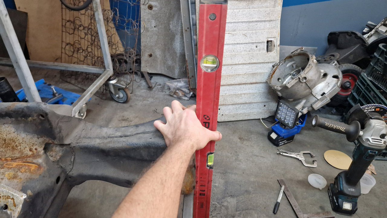 Potem zacząłem doprowadzać to do jakiejś geometrii. Ustaliłem sobie punkty odniesienia, czyli otwory, które są symetrycznie umieszczone na ramie. Od nich odmierzyłem równą odległość po obu stronach ramy i przymocowałem listwę. Przypominam - odciąłem przód na spawach. Po prawej jest strona kierowcy, praktycznie na równo z listwą, po lewej mamy prawie 2cm dłuższą ramę.