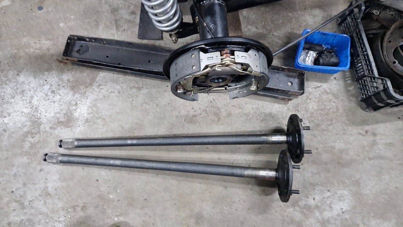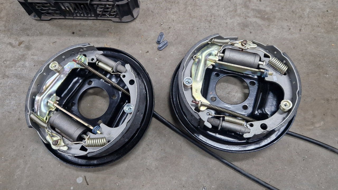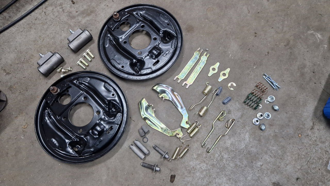 Mam już brakujące części do hamulców, więc wracamy do tego tematu. Tu mam wszystko (no dobra, szczęki uciekły z tego zdjęcia) do tylnych hamulców. Tarcze kotwiczne wyglądają lepiej po piaskowaniu. Cylinderki też są kupione nowe. Reszta jest odnowiona i ocynkowana.