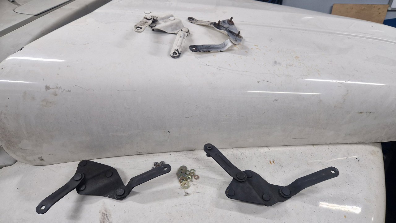 Zamontuję też maskę. Wyżej są stare zawiasy, niżej nówki sztuki.