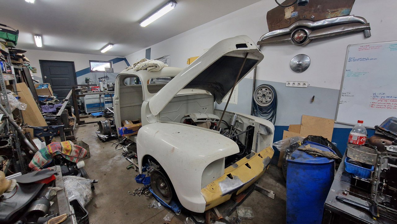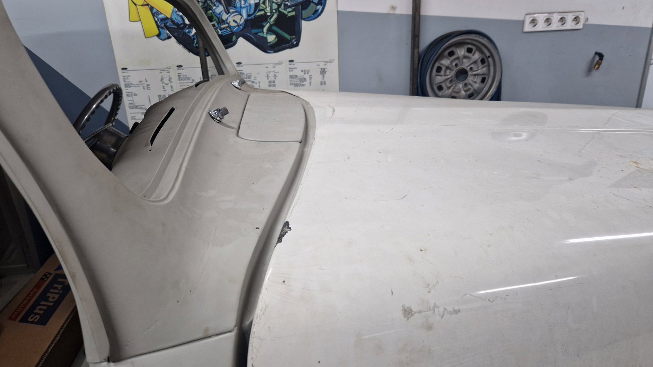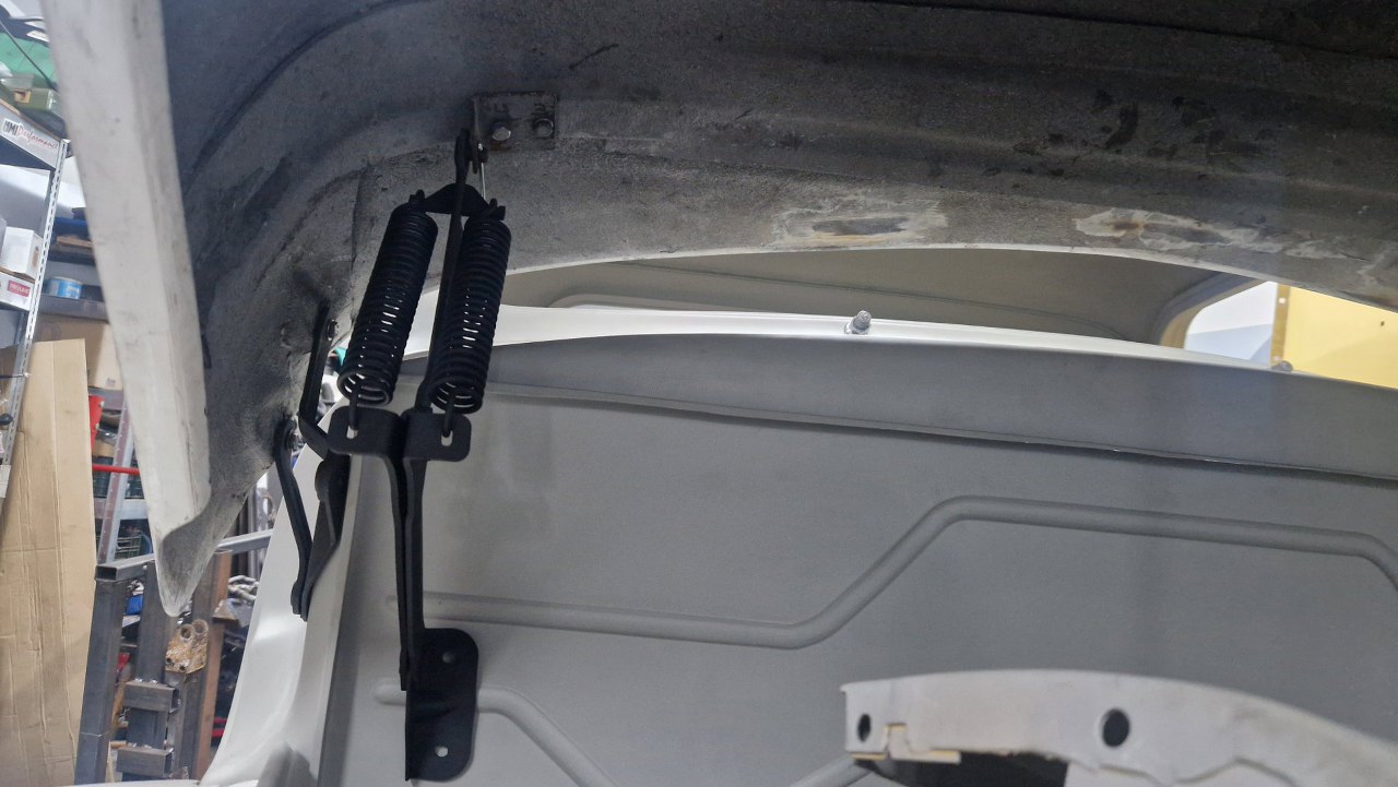 Przymierzyłem też sprężyny otwierania maski. Przy masce kątowniki są cięte siekierką, więc muszę narysować i zamówić nowe. Na dole nieco kolidują z przetłoczeniami, więc też muszę coś mymyślić z mocowaniem.