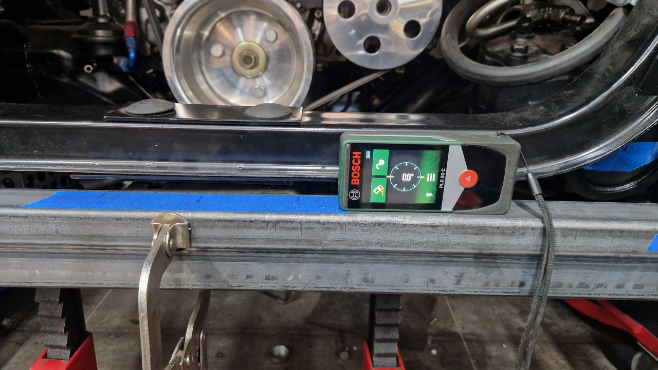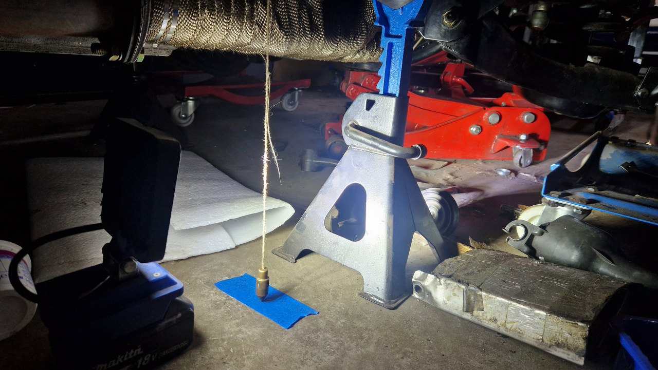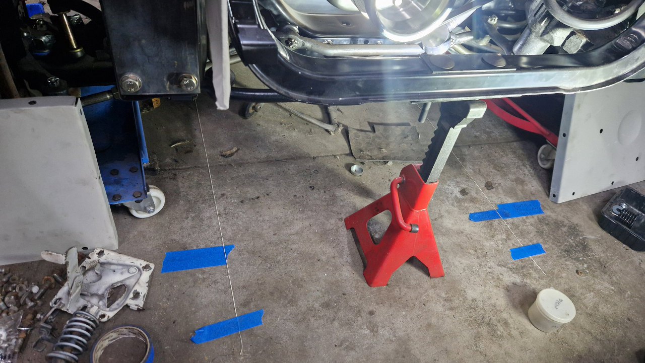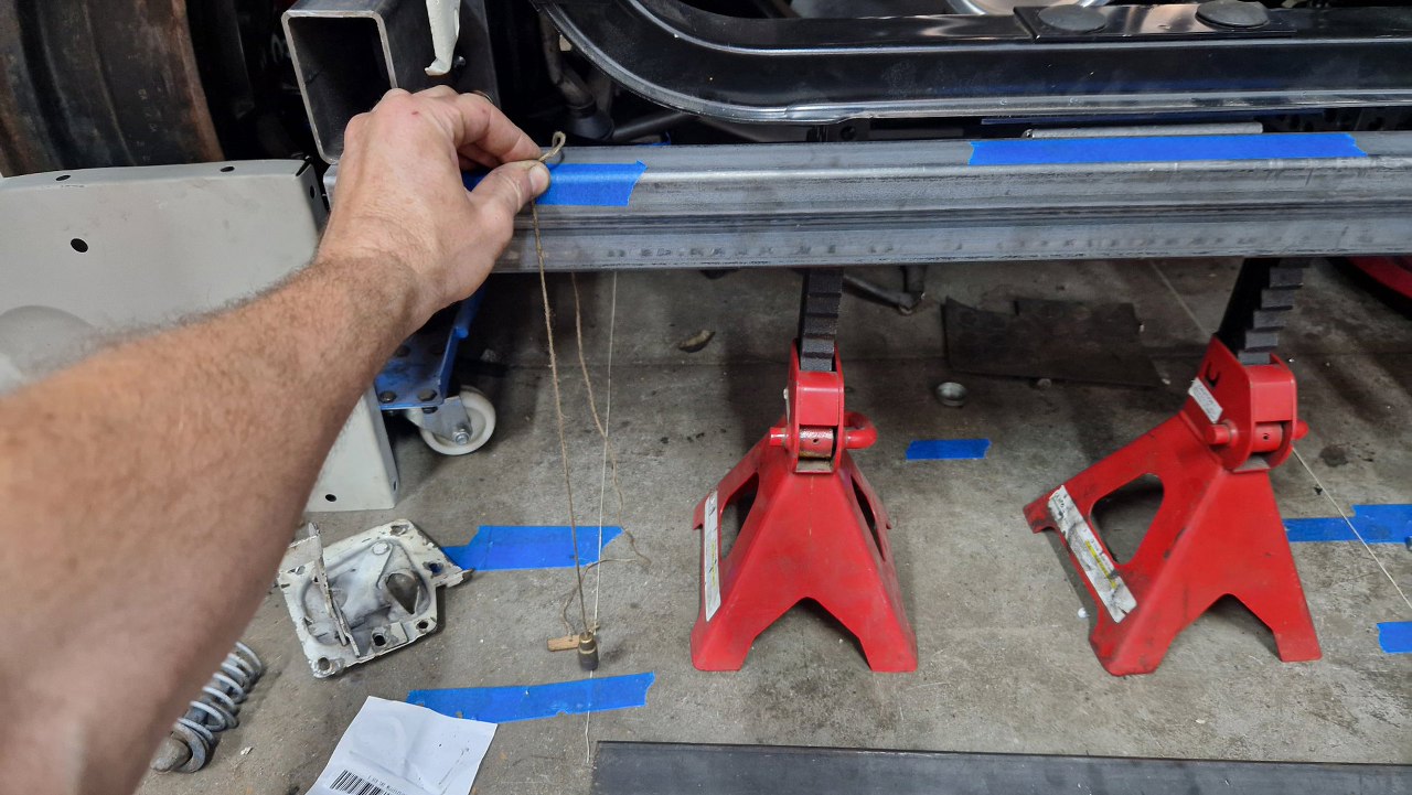 A tu widać te sznurki odwzorowujące podłużnice ramy. Wyciągnąłem je na tyle daleko do przodu, że mogę za pomocą pionu przenieść wymiary na przod ramy.