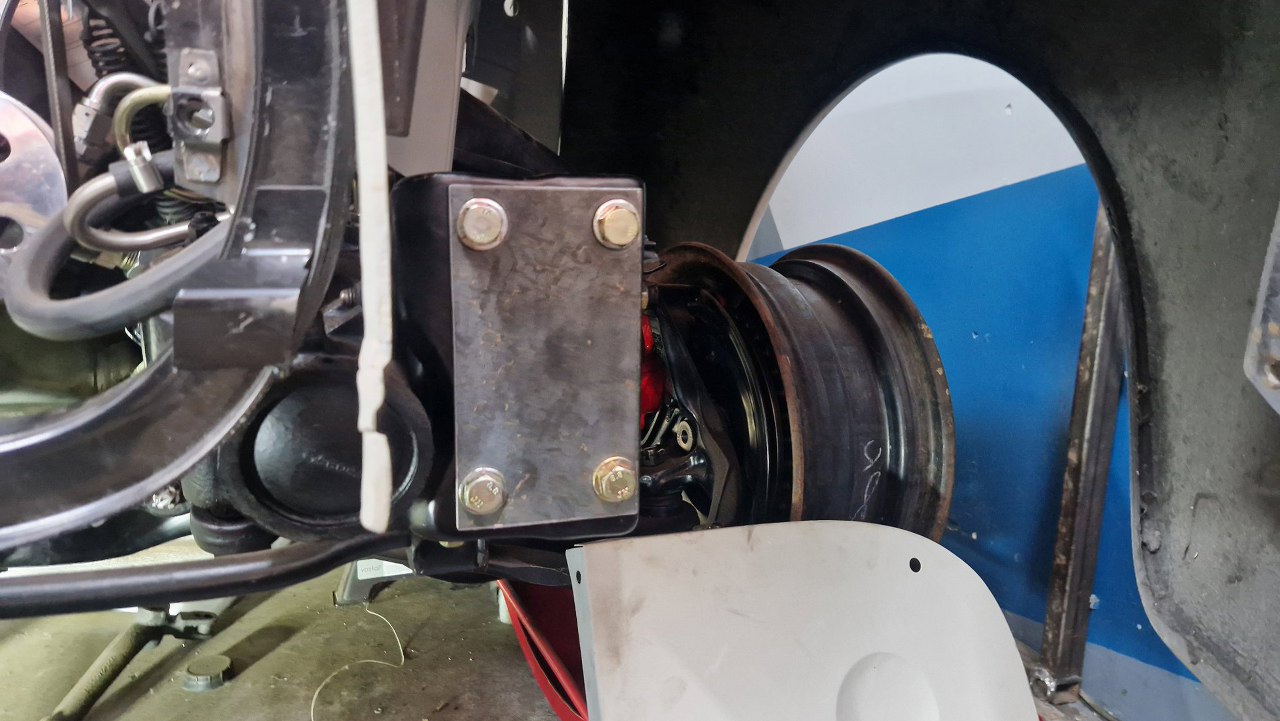 A tu blisko wewnętrznej! Okazuje się, że ten kawalek ramy nieco się oddala od osi auta, żeby zrobić miejsce na przekładnię kierowniczą. Tyle by było z symetrii :).