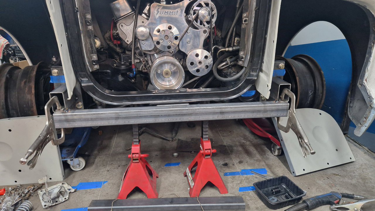 A tu już wstępnie złapane spawami. Oczywiście w międzyczasie trzeba niezliczoną ilość razy to montować i demontować, razem z częścią oblachowania przodu.