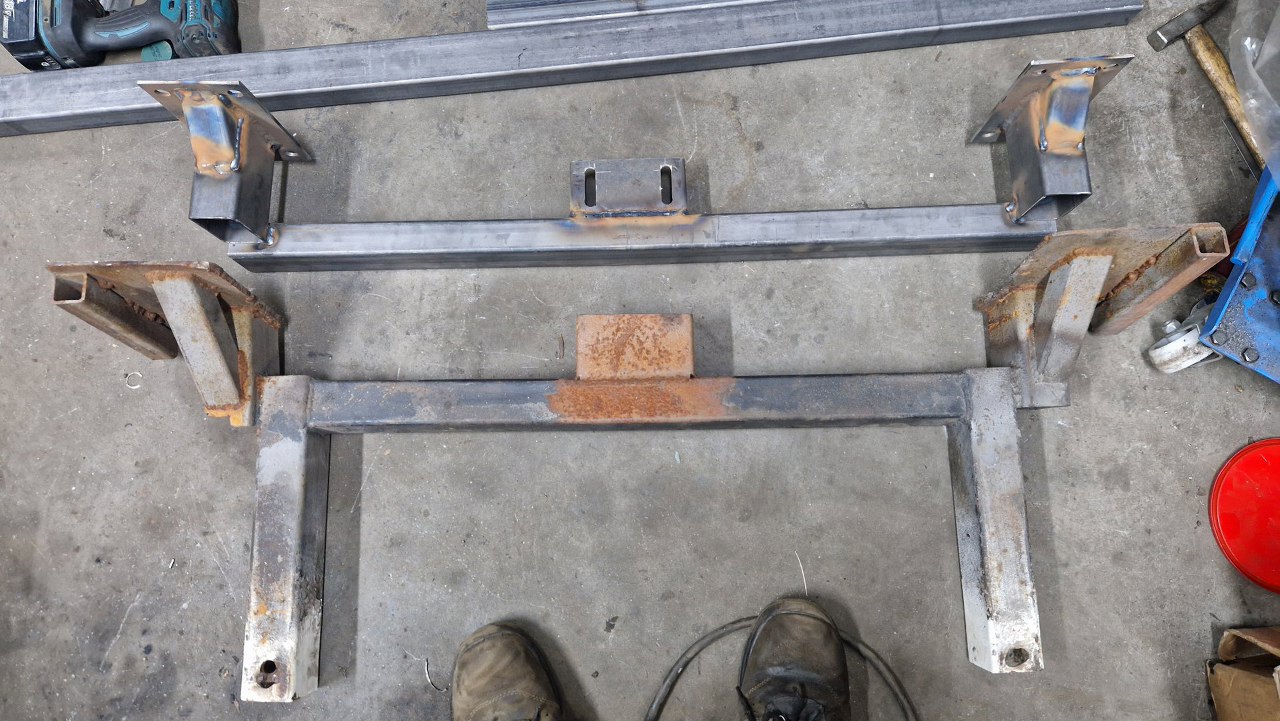 Przykręciłem to pośrodku mocowania chłodnicy - to właśnie tu opiera się cały przód samochodu. Do prostokątów po bokach dospawałem krótkie profile prostokątne.