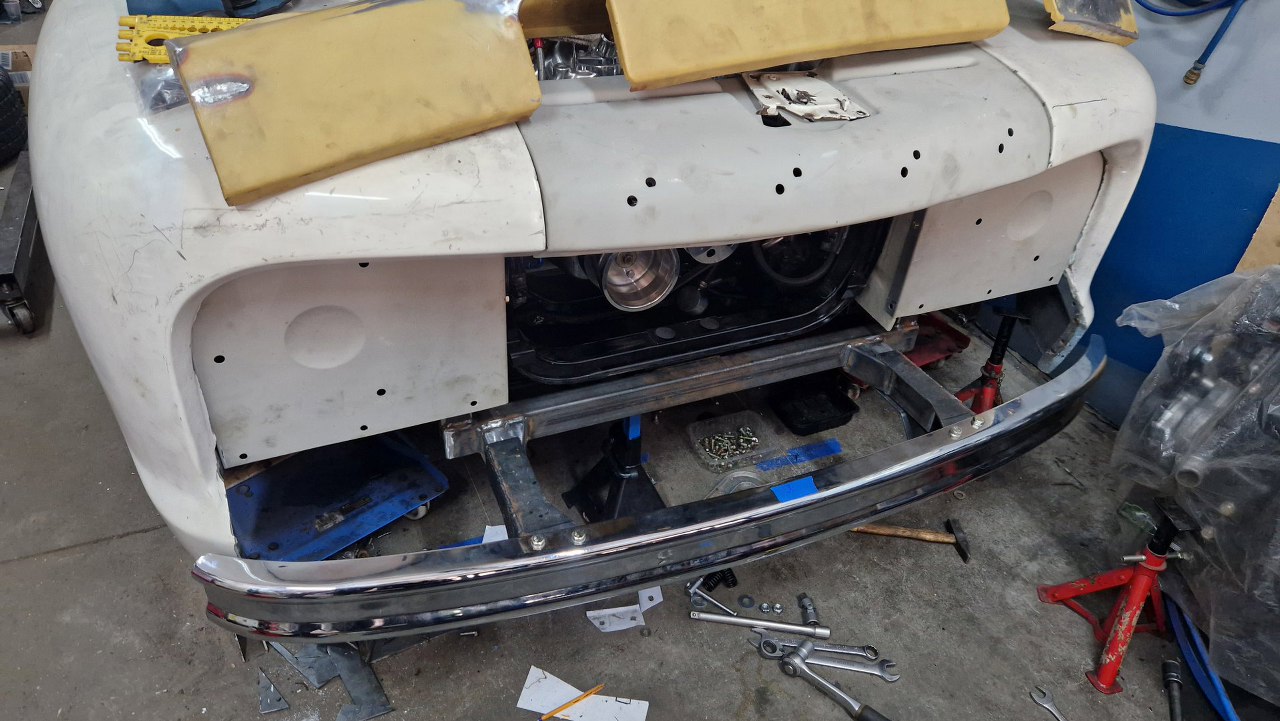 Przykręciłem mocowania do zderzaka, ustawiłem to wszystko przy karoserii, dociąłem i włożyłem części ramy.
