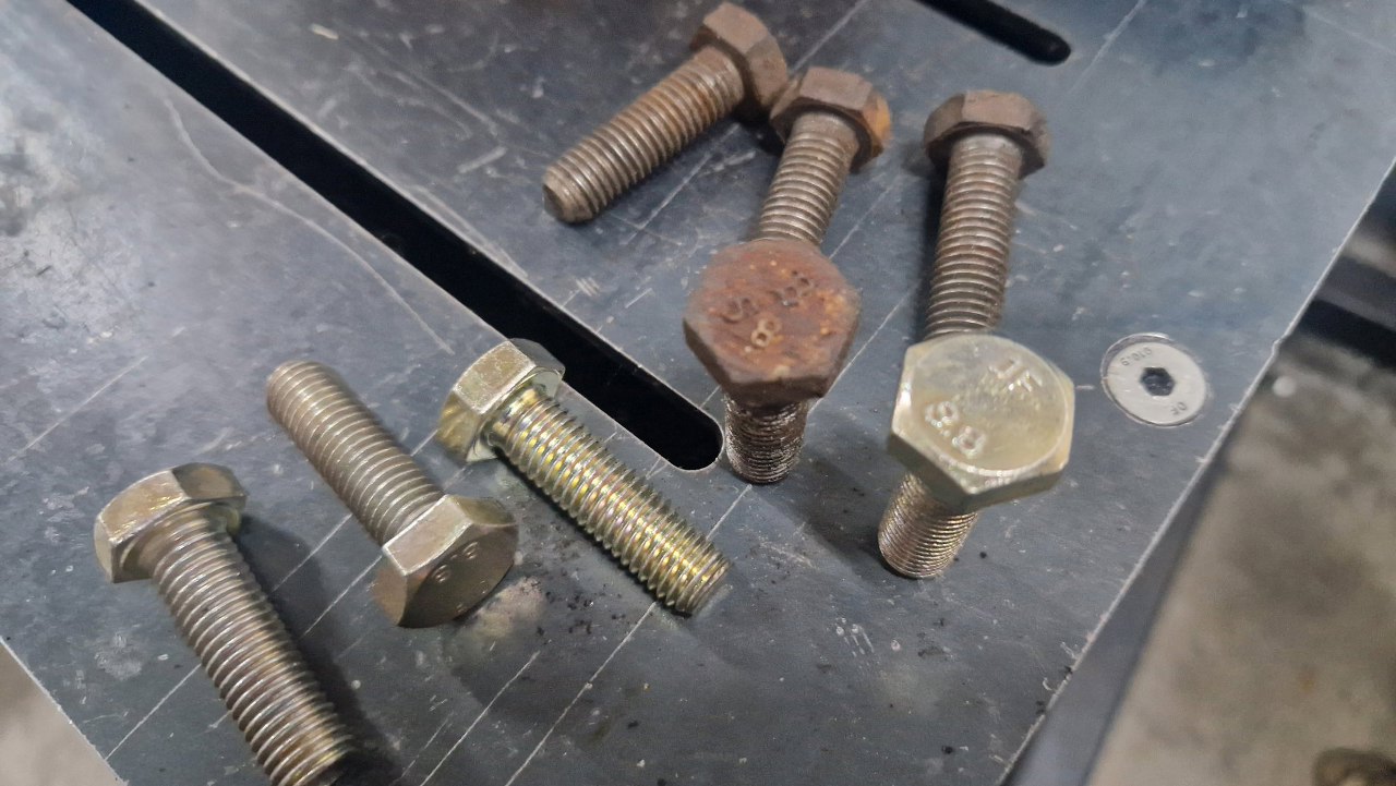 Pamiętasz, że w "nowej" obudowie skrzyni wierciłem i gwintowałem otwory na śruby mocujące wahacze? Wygrzebałem te śruby - to te zardzewiałe. Musiałem dać nowe, bo te stare już ktoś kiedyś wymienił na śruby o twardości 5.8, co jest za mało do zawieszenia.