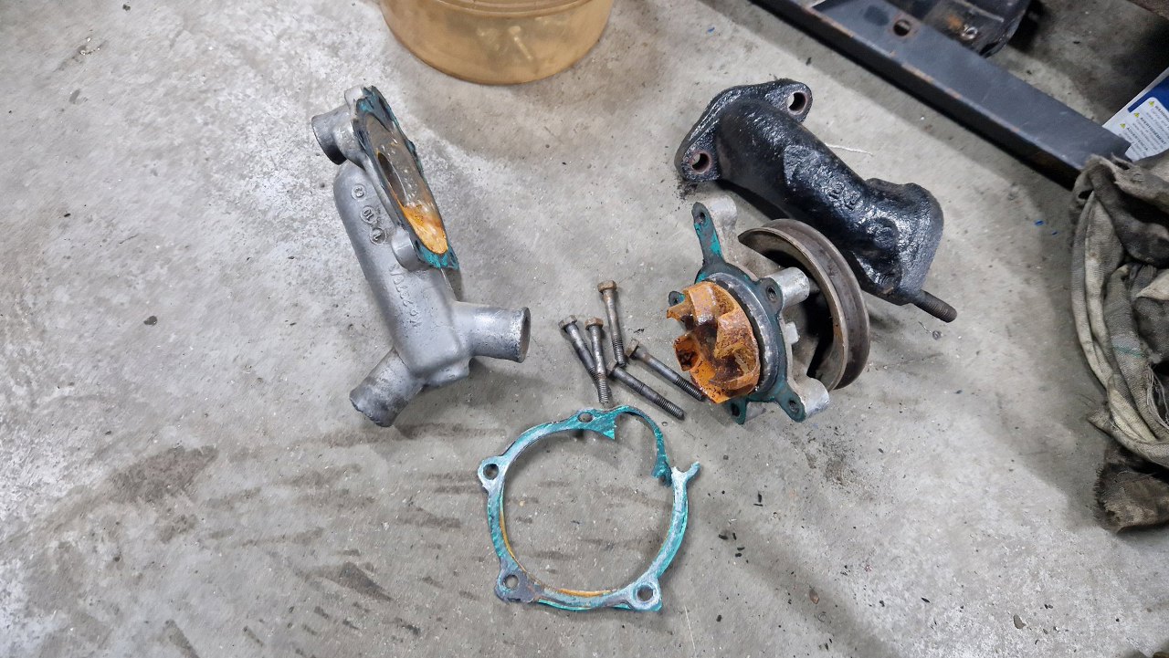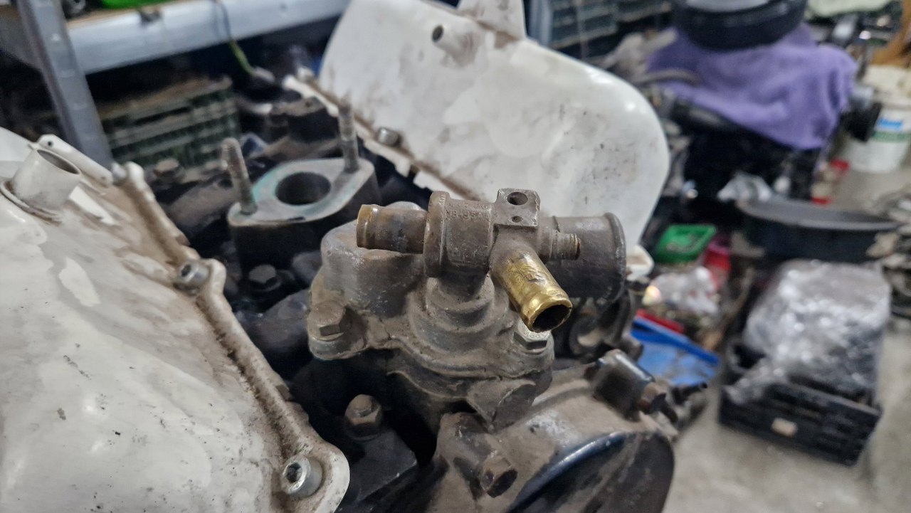 Odkręciłem i kolektor i pompę wody. Tylna jej pokrywa jest dość dziwna, takiej jeszcze w V4 nie widziałem - ma u dołu dwa wyjścia na grubą rurę. Ciekawe jak to wygląda w samochodzie.