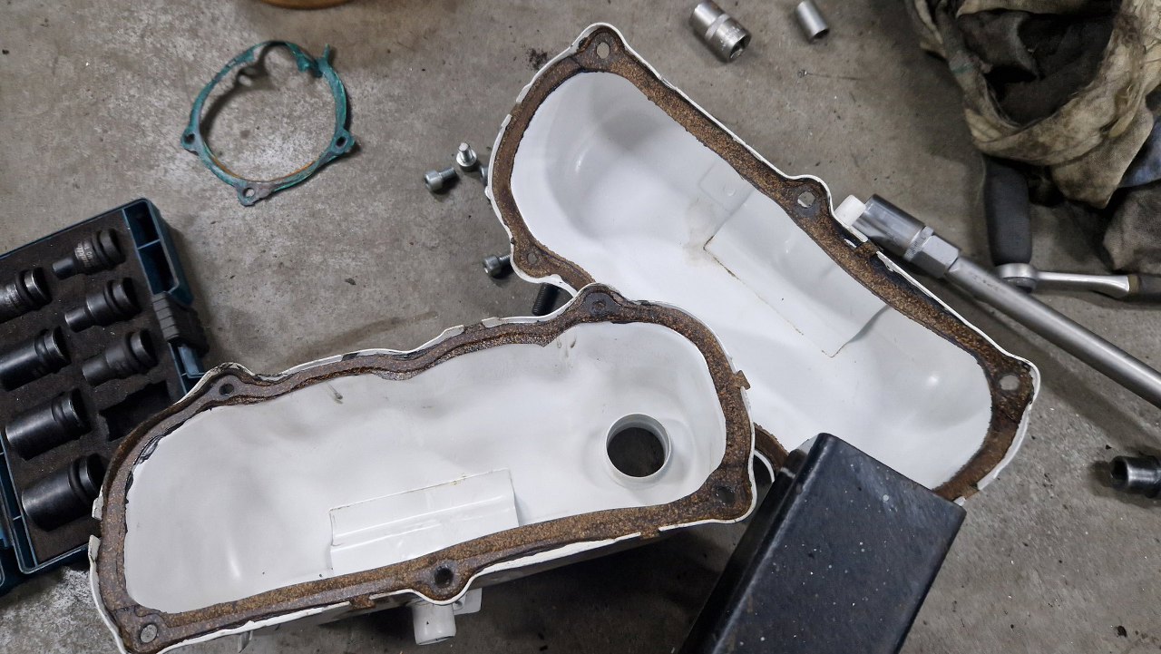Pokrywy od środka czyste, prawdopodobnie silnikz nimi nawet nie jeździł. To chyba dobrze, bo są pomalowane proszkowo od środka. Nie lubię tego, bo raz, że lakier może się tu łuszczyć, jaśli został źle położony, ale nawet jeśli nie, to dwa - podczas piaskowania zawsze może zostać nieco ścierniwa albo syfu pod tymi blaszkami w środku pokryw. Po rozgrzaniu silnika to wszystko się wydostaje i niszczy silnik. Pokrywy definitywnie do poprawki.