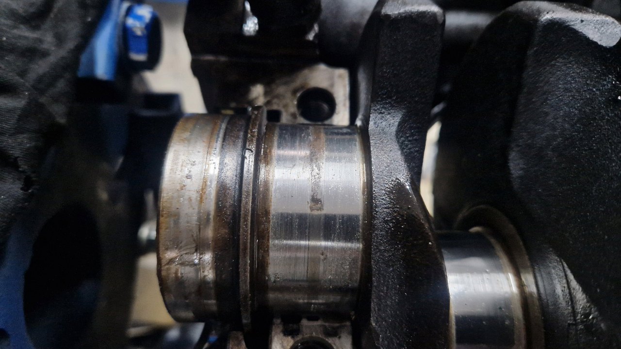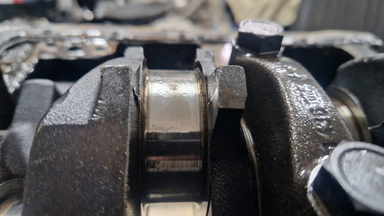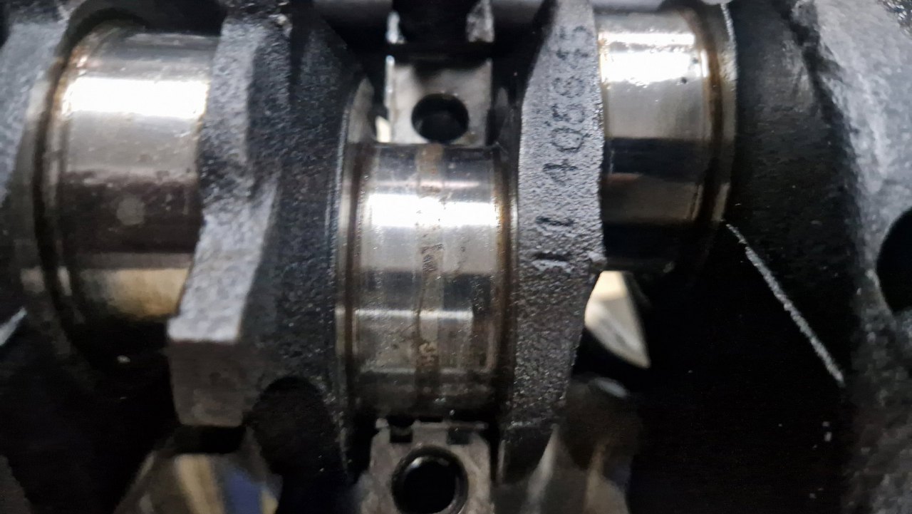 Podobnie z czopami głównymi - są rysy i nadają się do szlifu. Panewki również zużyte. Wał w 1,2 jest ten sam, co w 1,5, ma nawet oznaczenie 15 na jednej z przeciwwag (tu tego nie widać).
