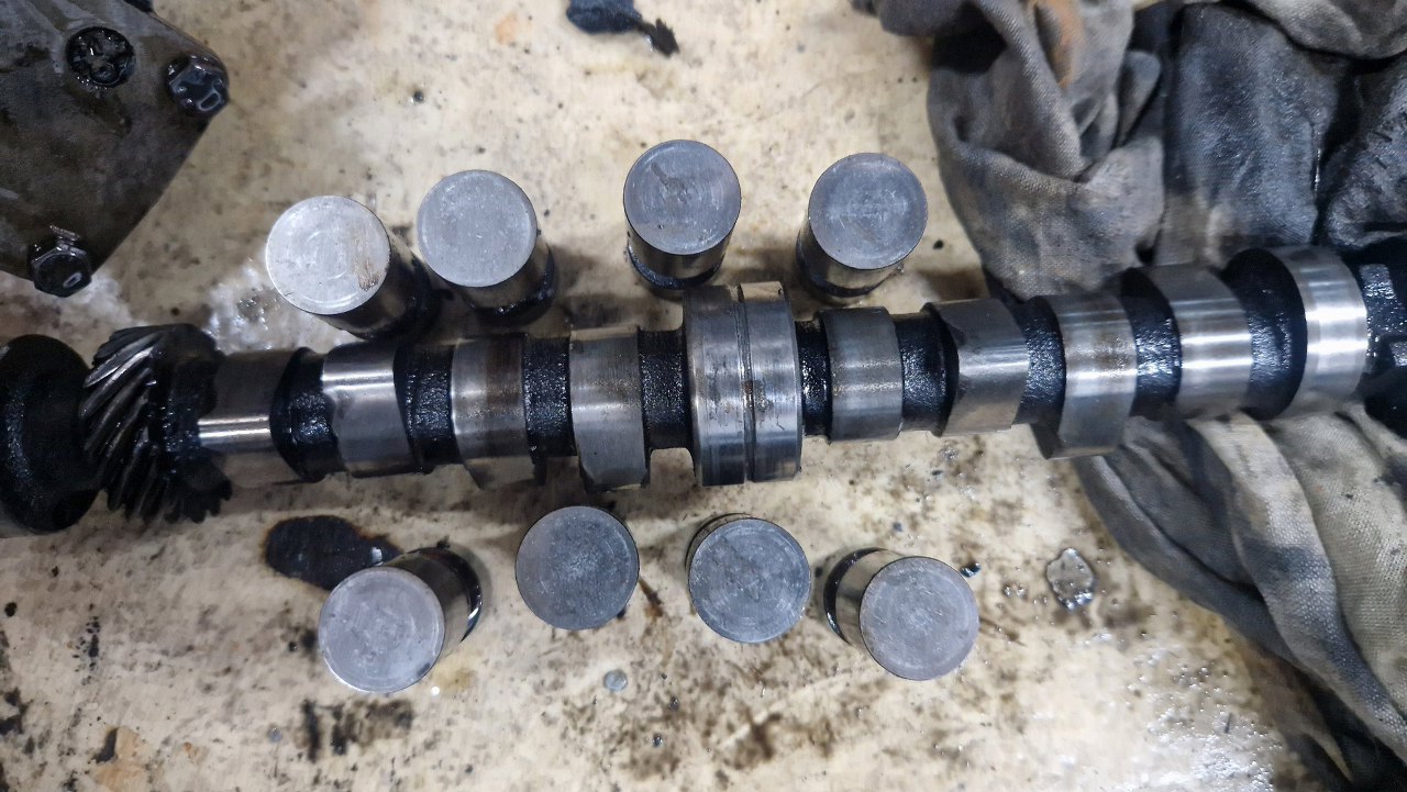 Wałek rozrządu nawet w niezłym stanie, łącznie z popychaczami.
