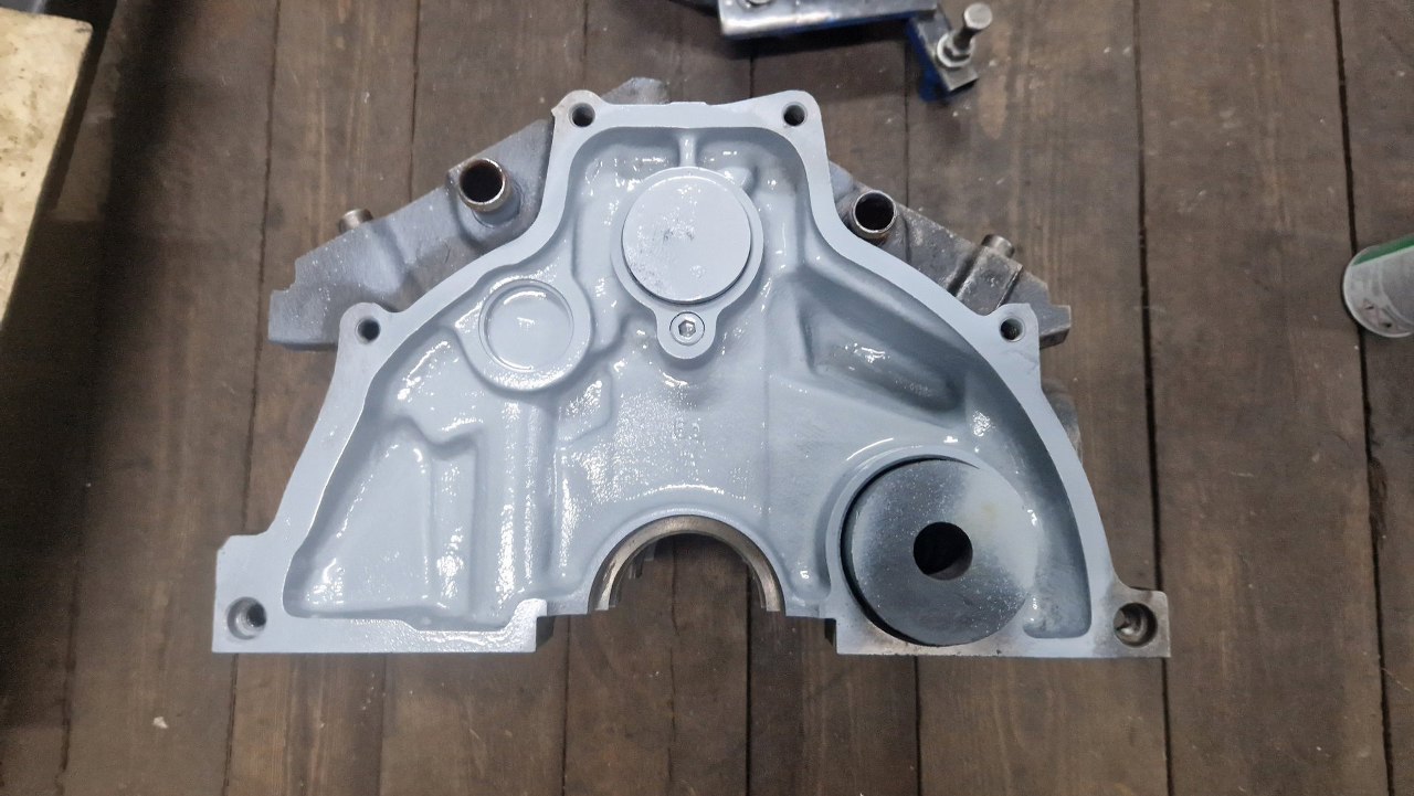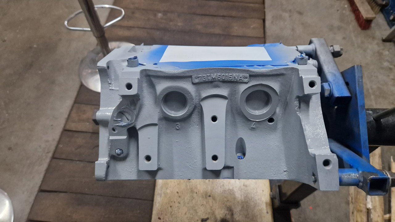 Po odtłuszczeniu bloku pomalowałem podkładem tylną część jeszcze zanim wrzuciłem blok z powrotem na stojak. Tu nie musi być pomalowane idealnie, bo i tak zasłania go koło zamachowe i skrzynia, ale chociaż niech podkład będzie dokładnie położony.