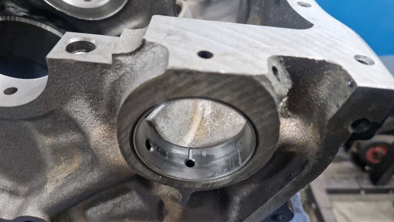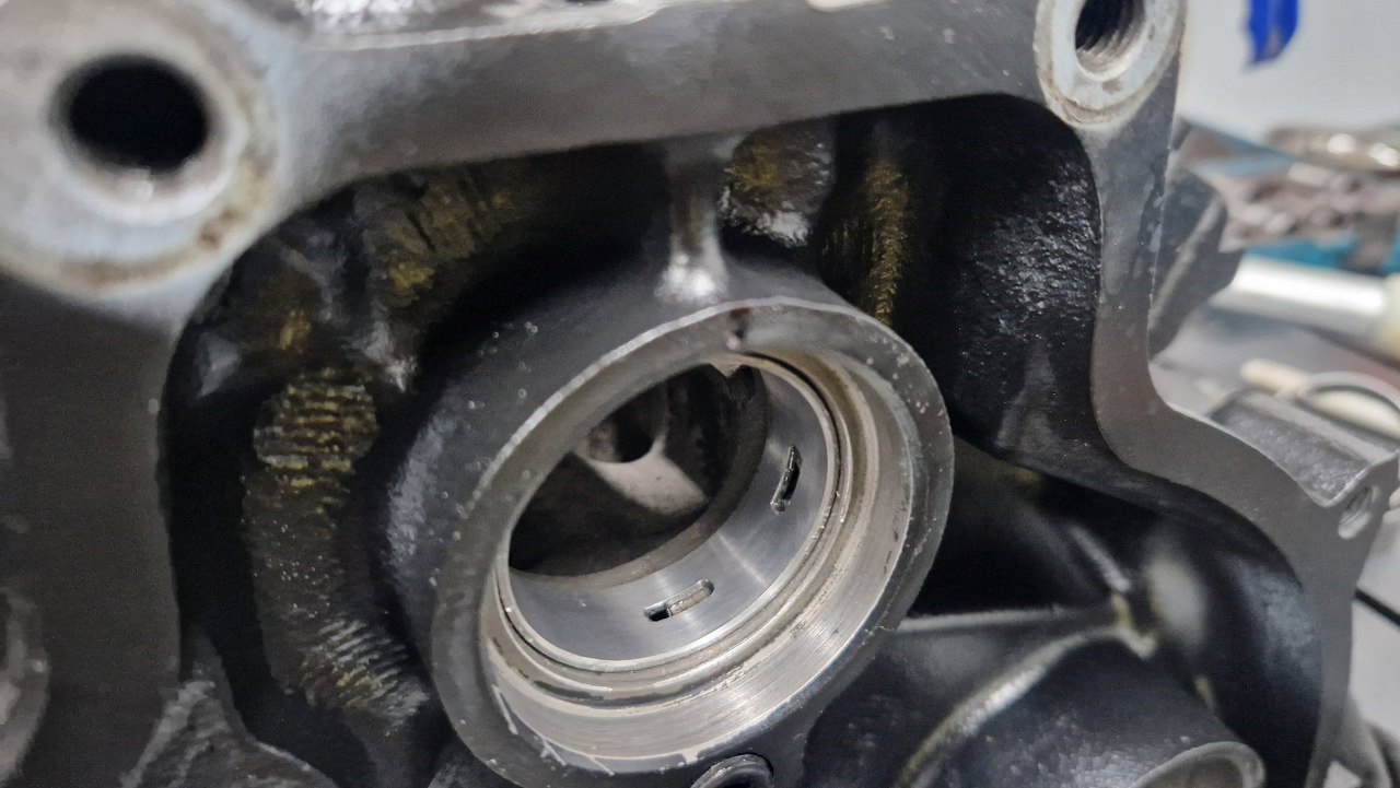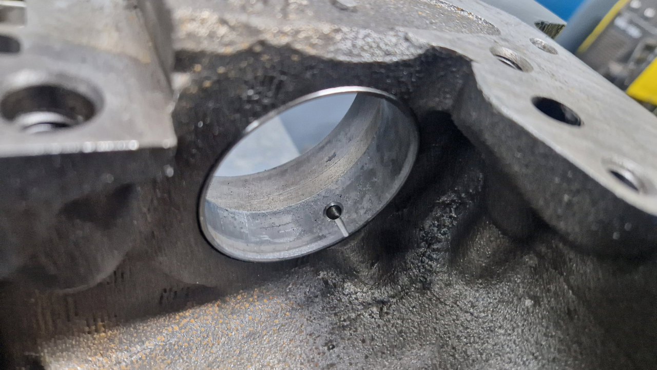 Potem pomalowałem blok dwa razy lakierem. Dostęp od tylnej strony na stojaku jest słaby, ale i tak w miarę się udało wszędzie dotrzeć z farbą. Po wyschnięciu blok trafił na stół a ja przyjrzałem się panewkom wałków rozrządu i wyrównoważającego. Tu wido tylnej panewki wałka balansu, od strony środka silnika. Rowek od otworu na magistralę olejową powinien być skierowany w zupełnie drugą stronę, żeby smarować płaszczyznę oporową wałka z blokiem... Trzeba to poprawić.