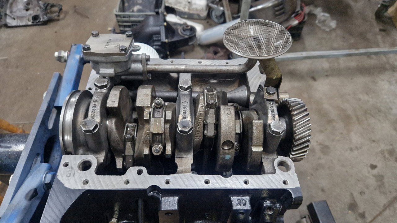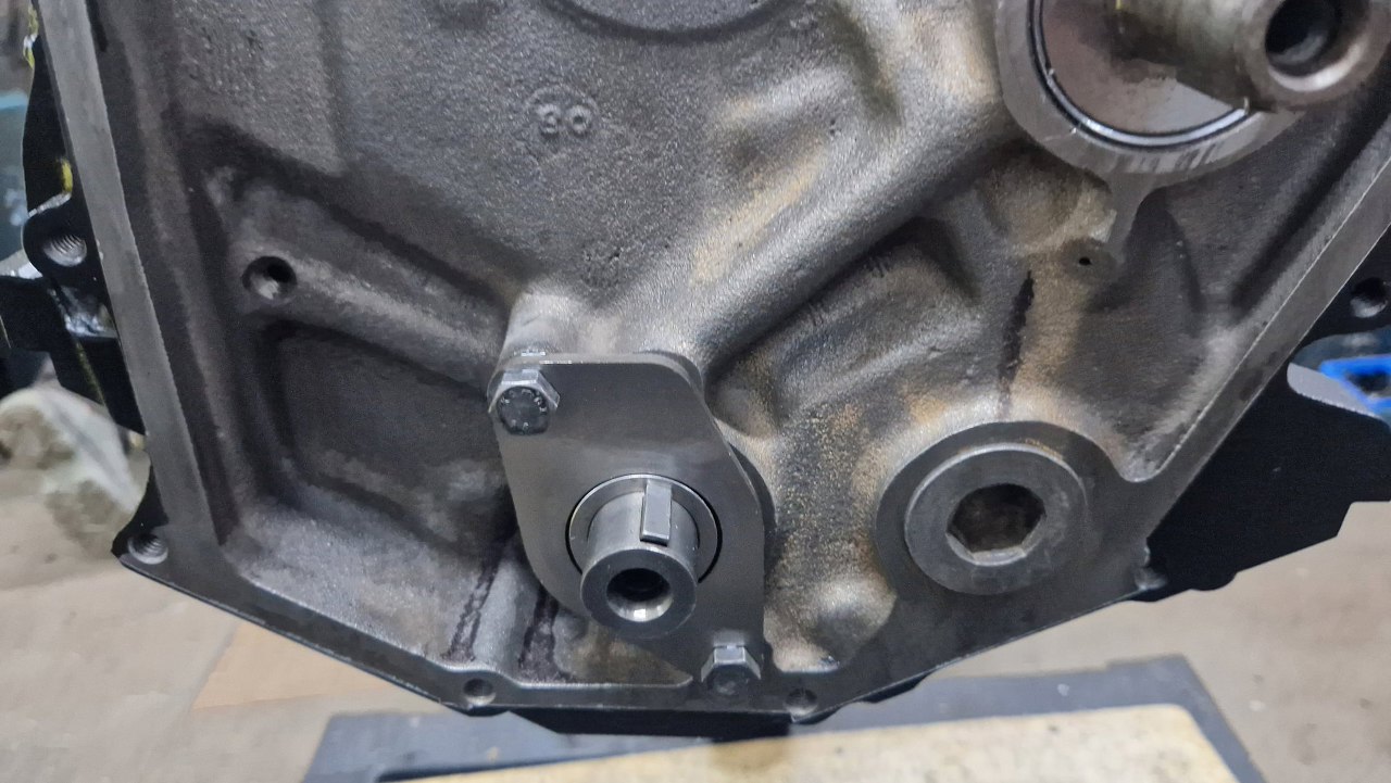 Potem pompę oleju przykręciłem do bloku. W przypadku miski oleju z głęboką częścią z przodu mamy długi smok pompy, który jest podparty do pierwszej stopy wału.