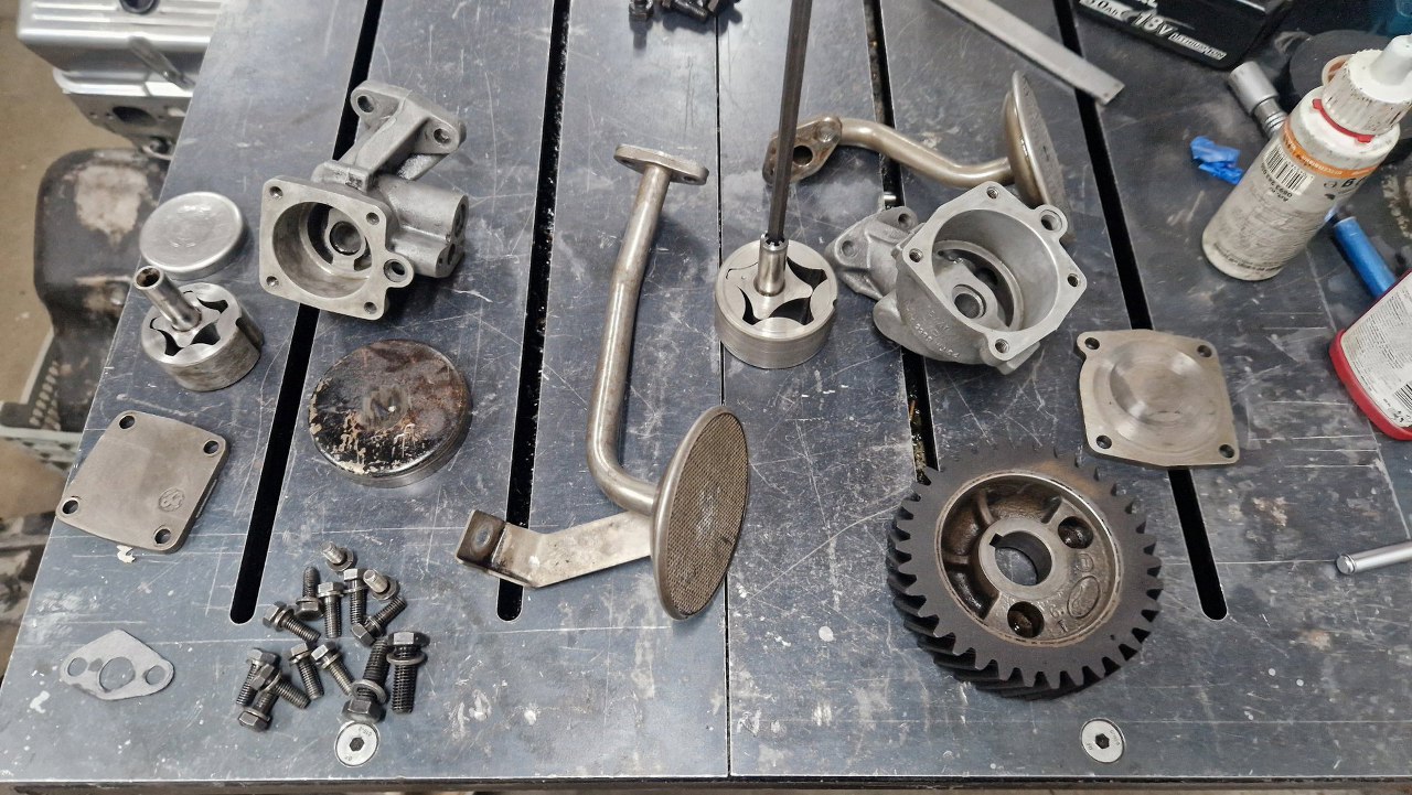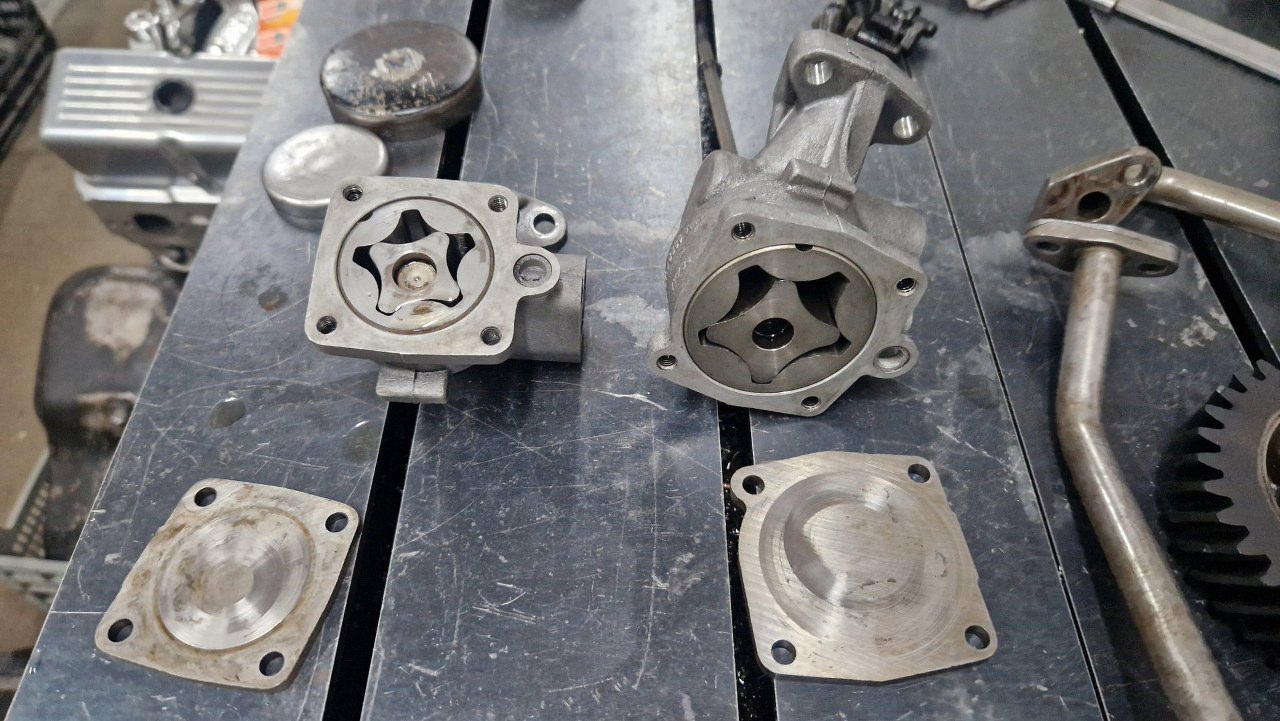Zrobiłem też mycie i przegląd pomp oleju. Po lewej jest pompa z wczesnych V4 (czyli z tego 1,2), a po lewej - z V6 i późnych V4, które dostawały tą samą pompę co V6. Ze względu na większą jej wydajność, użyję pompy po prawej. To, że utknął w niej pręt sześciokątny ją napędzający z aparatu zapłonowego, to tylko drobna sugestia, że lepiej ją użyć :).