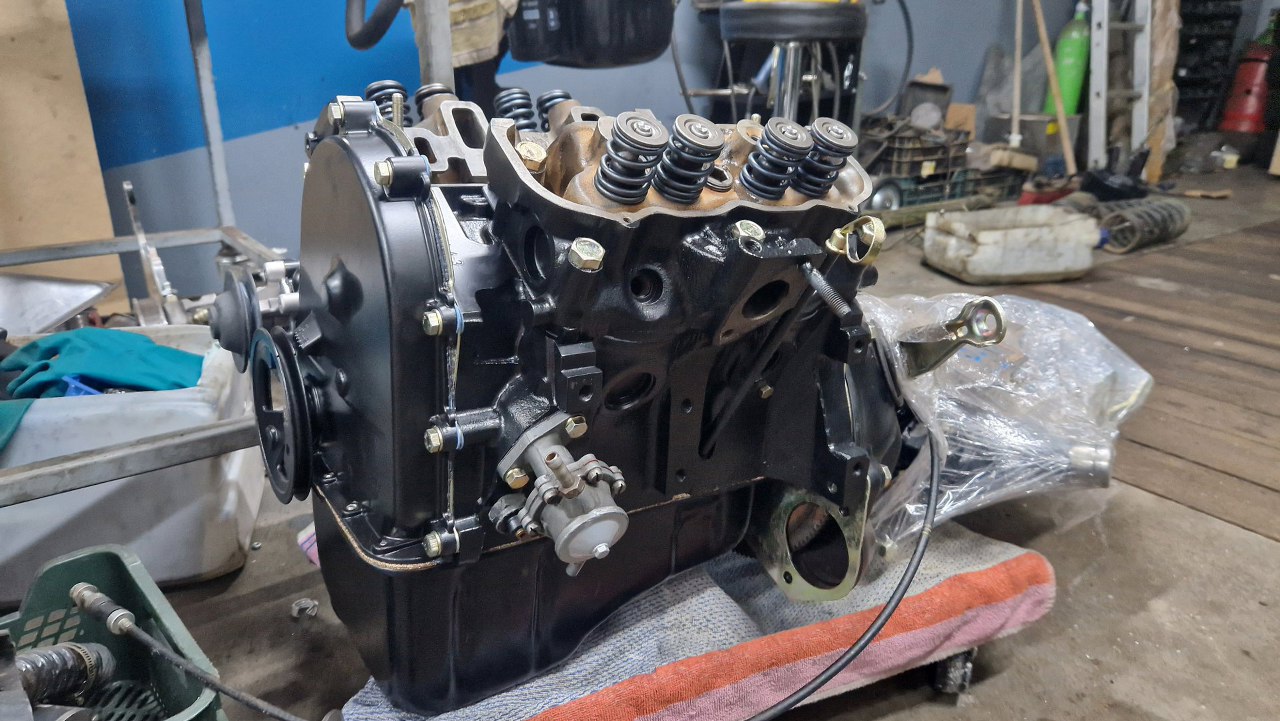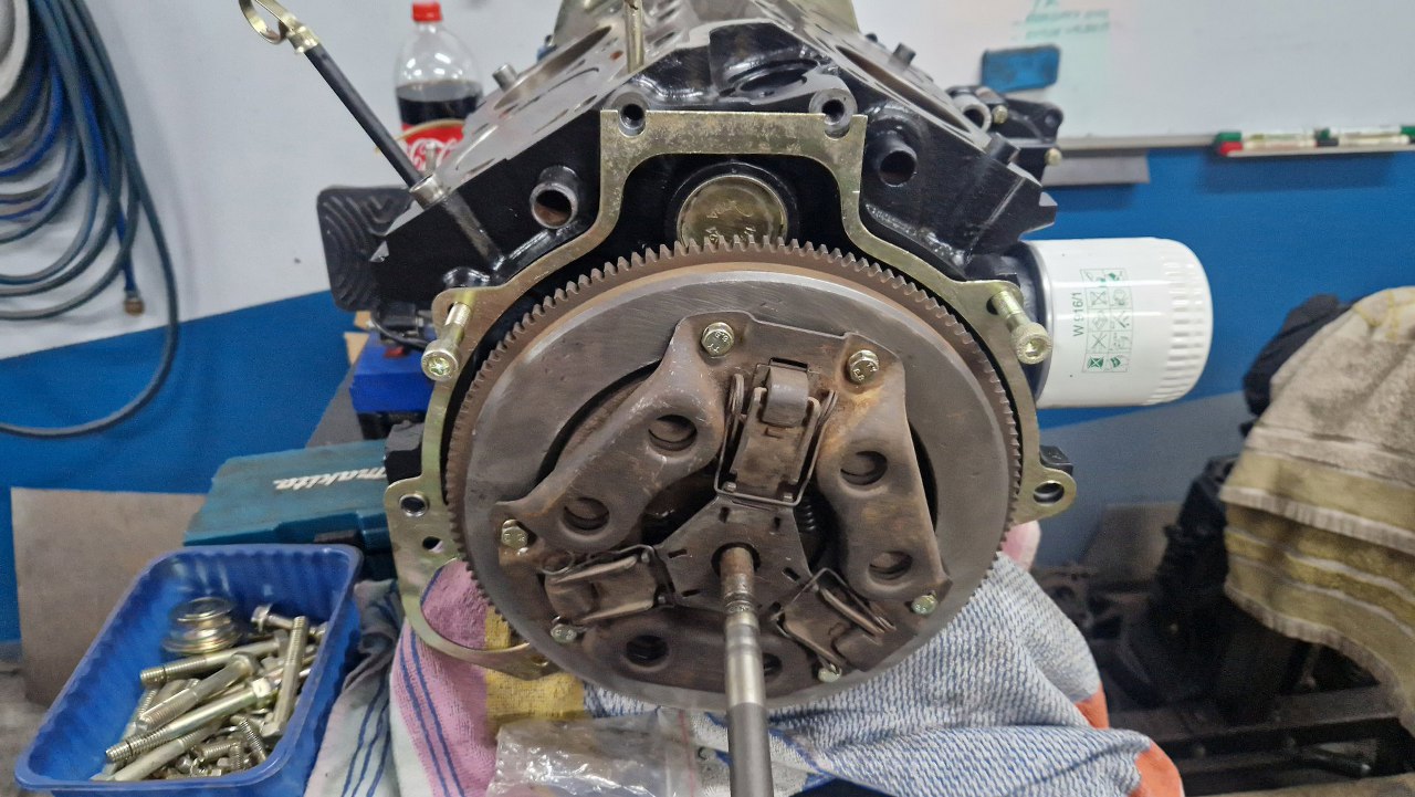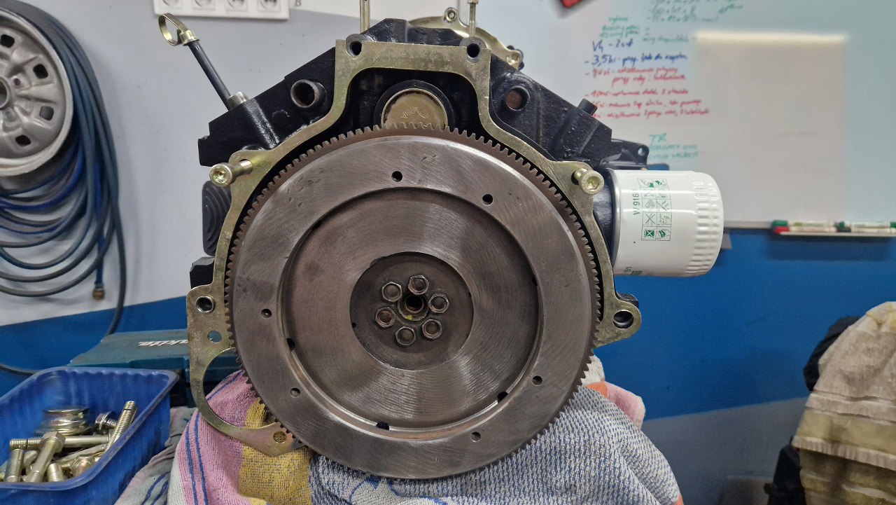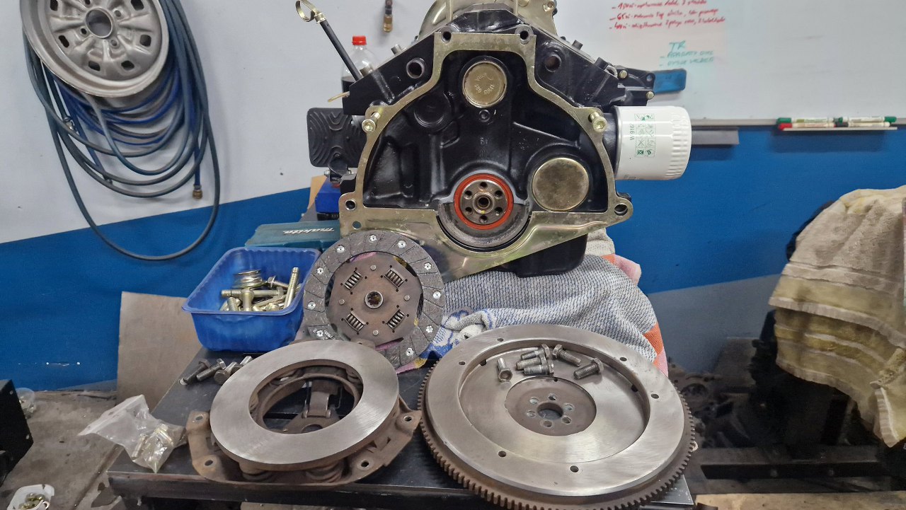 A skoro tak, to może bym połączył silnik i skrzynię? Niedawno odebrałem też tarczę sprzęgła z nabicia nowych okładzin. Koło i docisk są w niezłym stanie, po doczyszczeniu są gładkie.