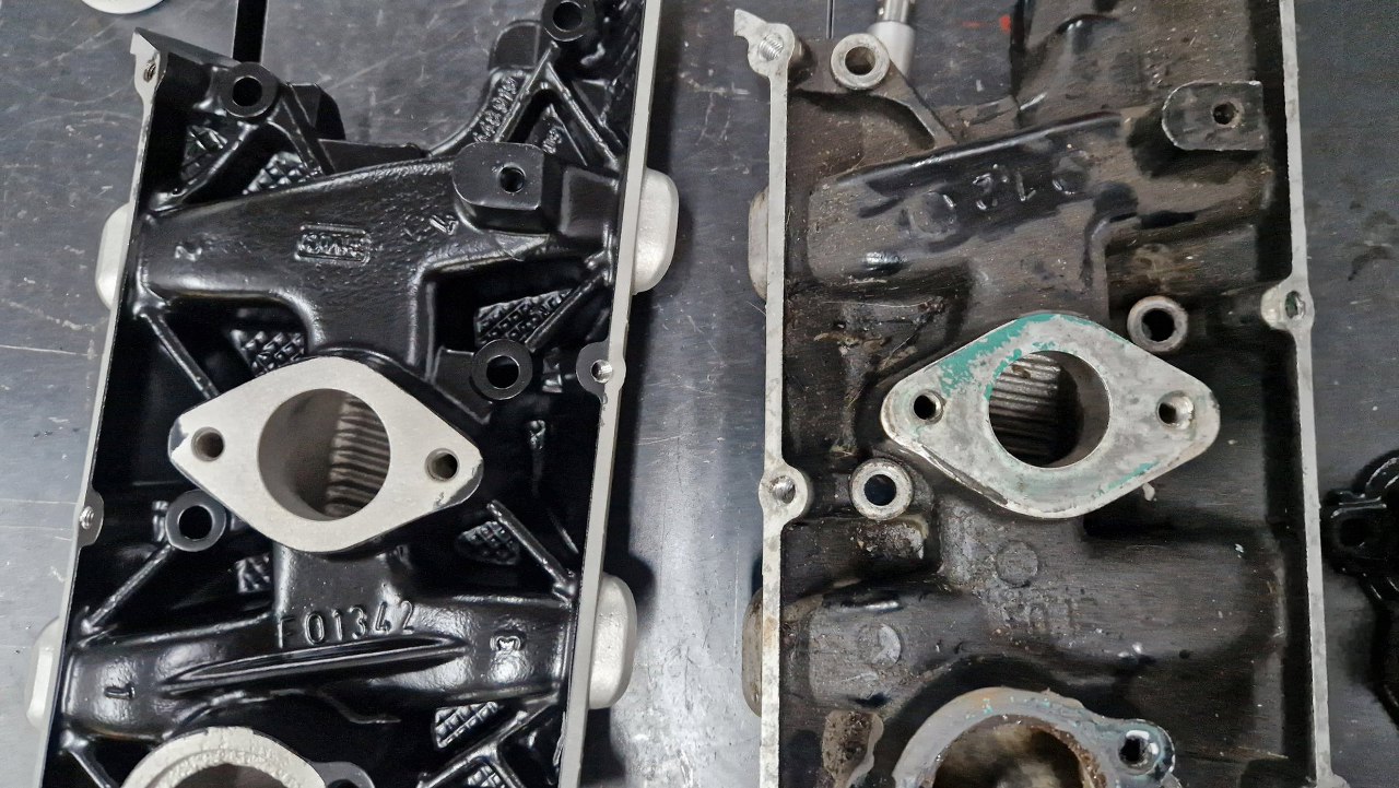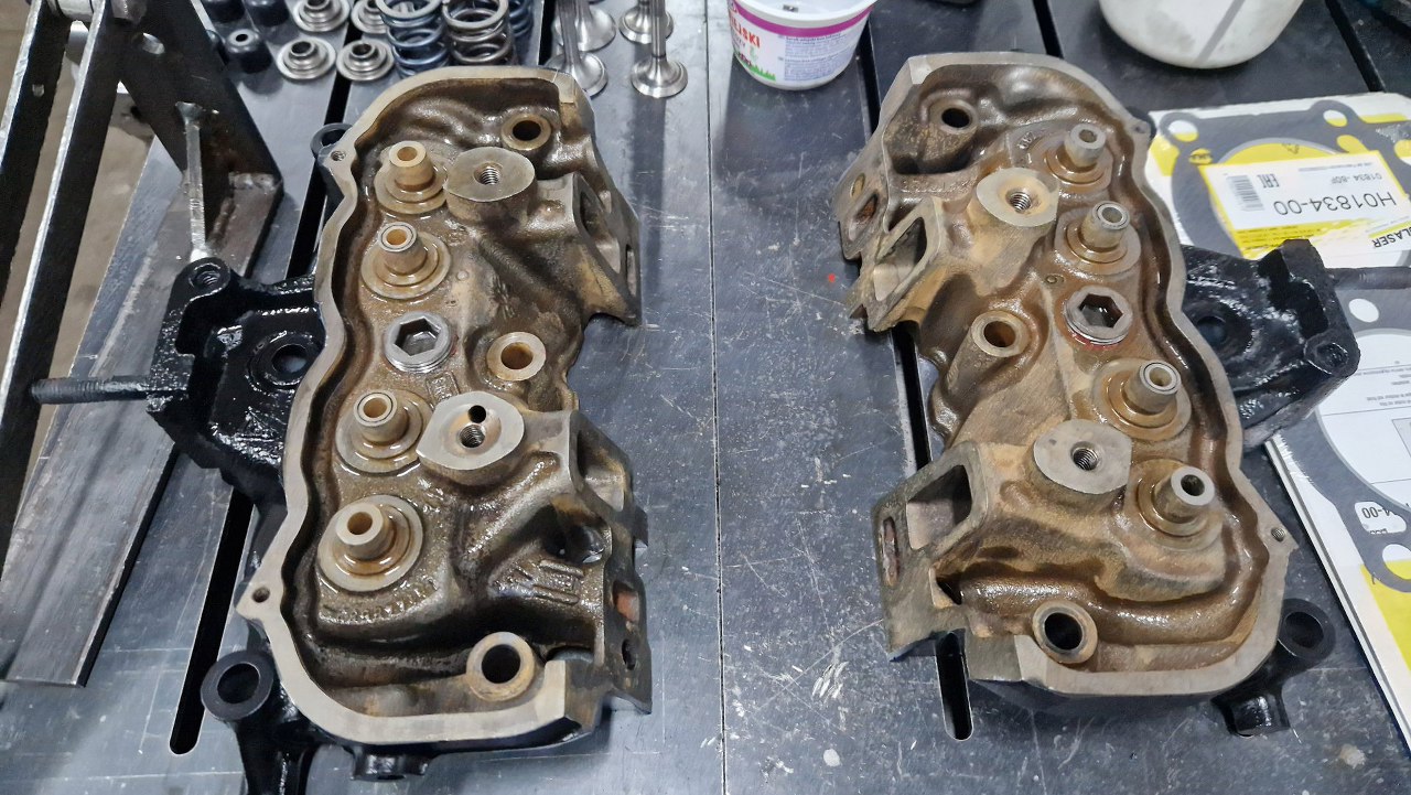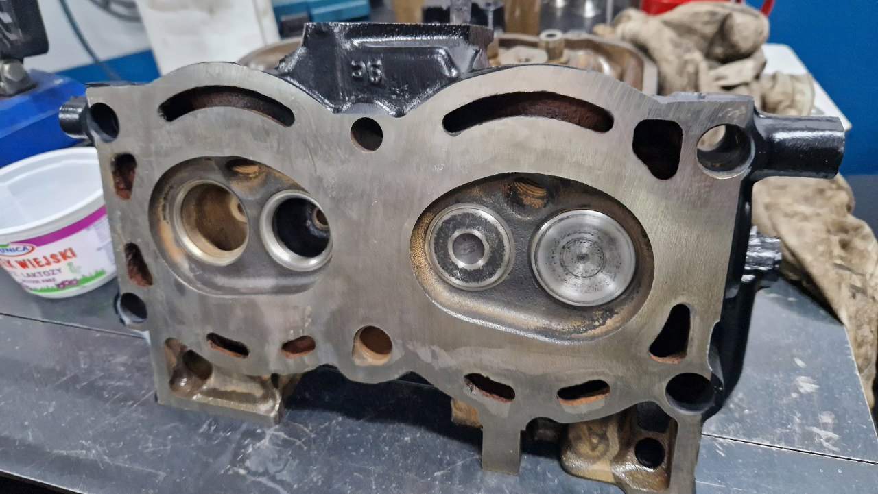 Głowice odebrałem ze szlifierni, gdzie były splanowane, wstawione zostały nowe prowadnice zaworowe na wydechach, podobnie wstawione zostały twarde gniazda zaworów wydechowych. Same zawory były w dobrym stanie i po przeszlifowaniu przylgni zostaną użyte ponownie. Głowice po umyciu pomalowałem.