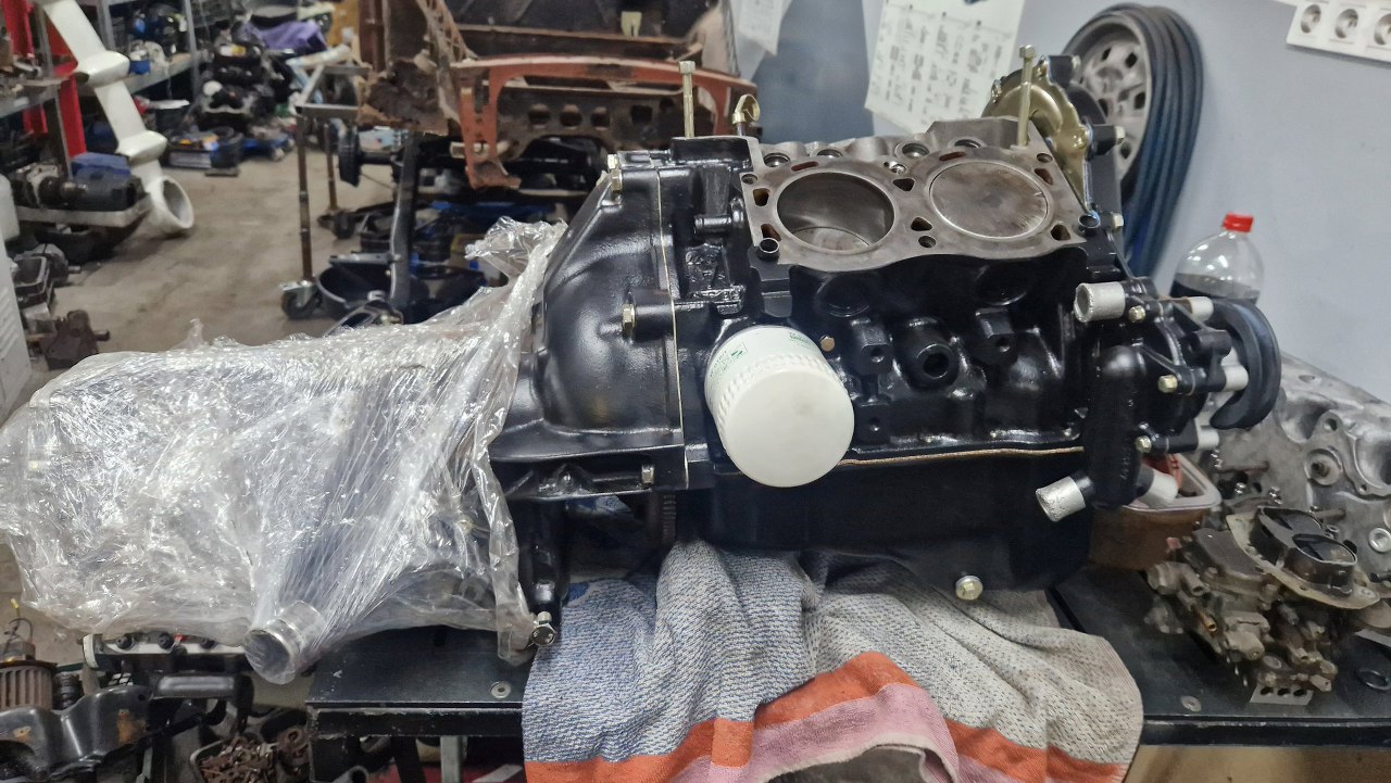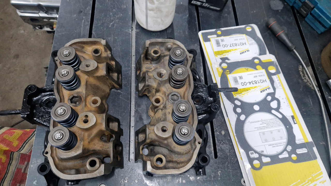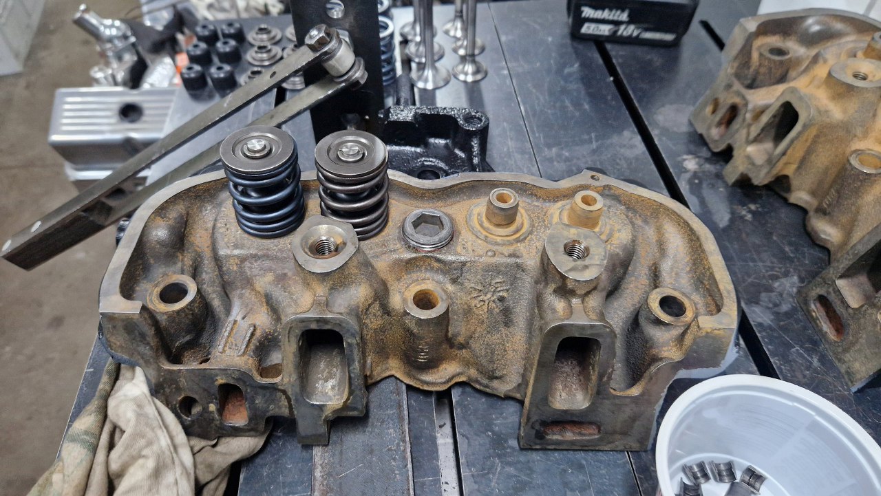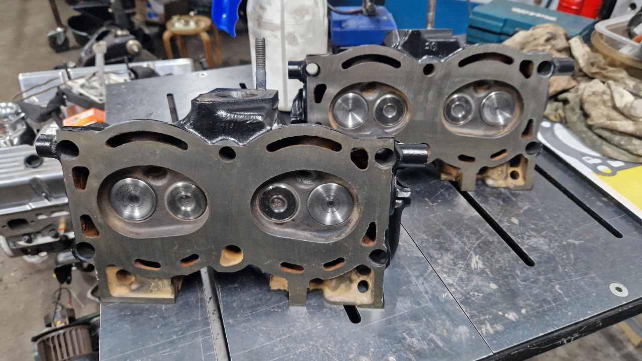 Głowice odebrałem ze szlifierni, gdzie były splanowane, wstawione zostały nowe prowadnice zaworowe na wydechach, podobnie wstawione zostały twarde gniazda zaworów wydechowych. Same zawory były w dobrym stanie i po przeszlifowaniu przylgni zostaną użyte ponownie. Głowice po umyciu pomalowałem.