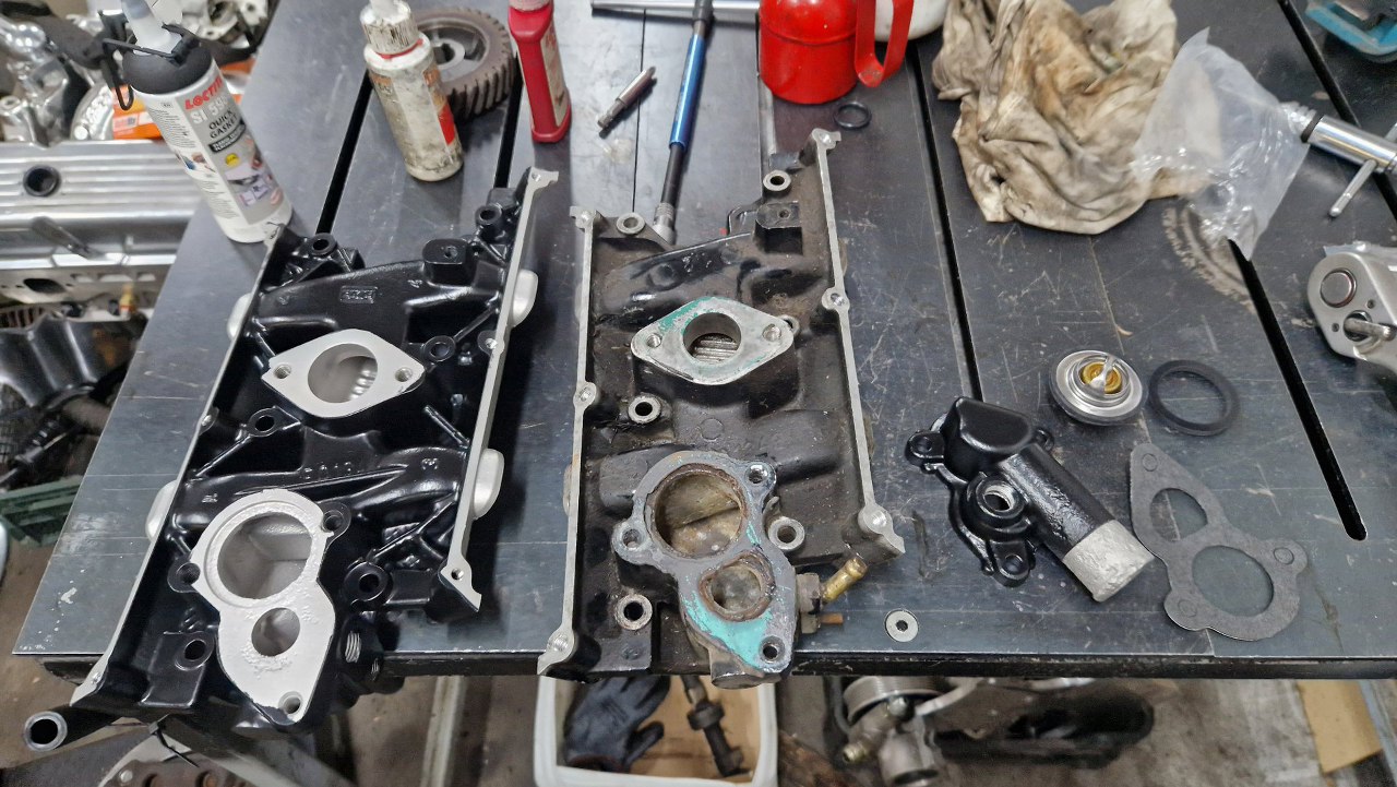 Przejdźmy do kolektorów dolotowych. Są oczywiście dwa. Po prawej oryginalny z 1.2, po lewej wygrzebany z zapasów, od 1.5/1.7. Ponieważ w silniku 1.2 nie było termostatu, musiałem dać nowy. Pokrywka termostatu z 1.2 była pęknięta, więc też jest nowa.