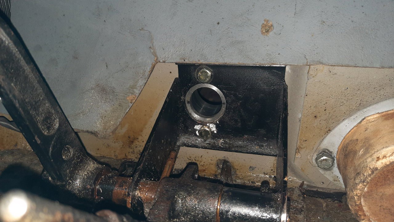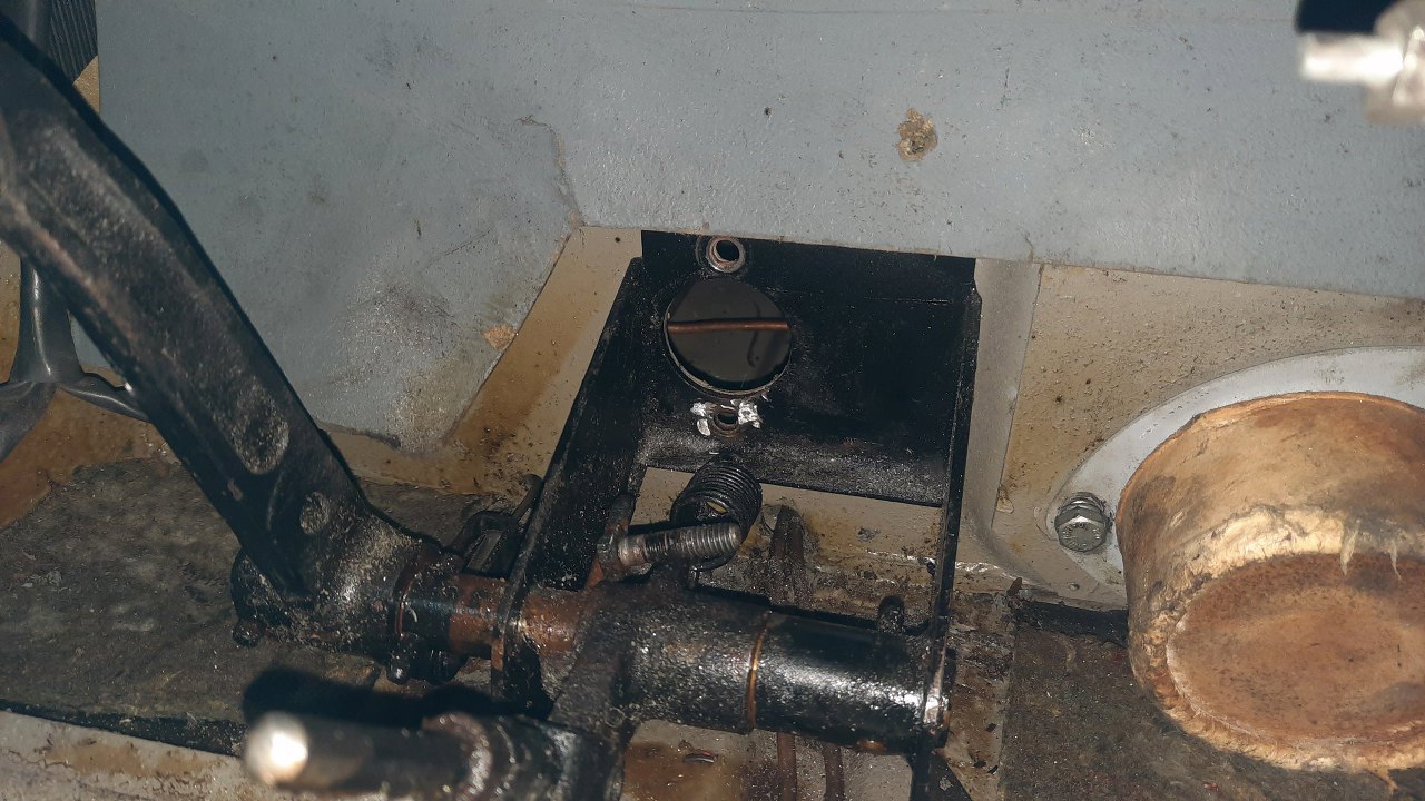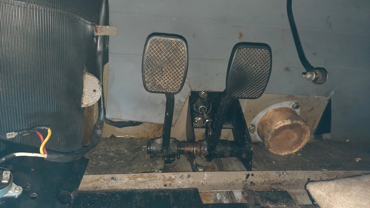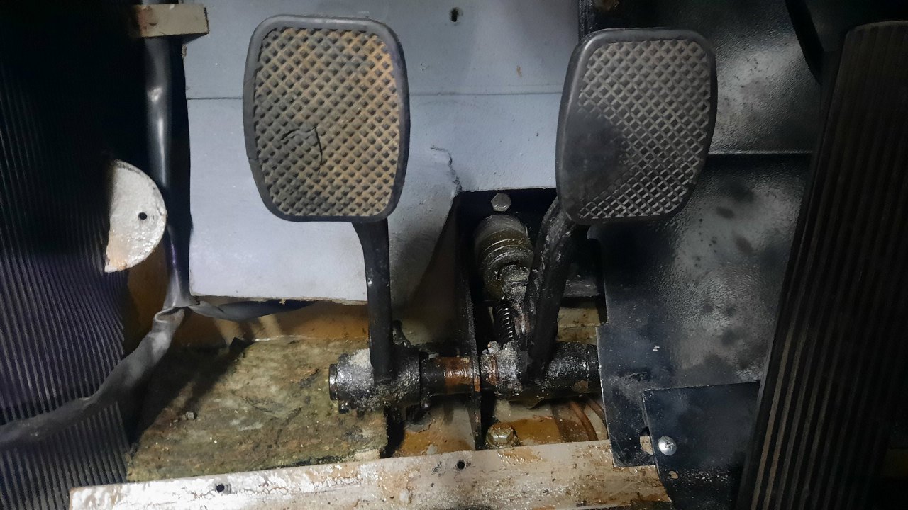 Jedna nakrętka trzymająca pompę jest od strony silnika, odkręca się ją w miarę łatwo, bo szpilka jest wspawana na stałe w mocowanie pedałów. Druga jest śruba na wylot, więc trzeba się dostać do pedałów od strony kabiny. Całość, pod wykładziną, osłonięta jest blachą.