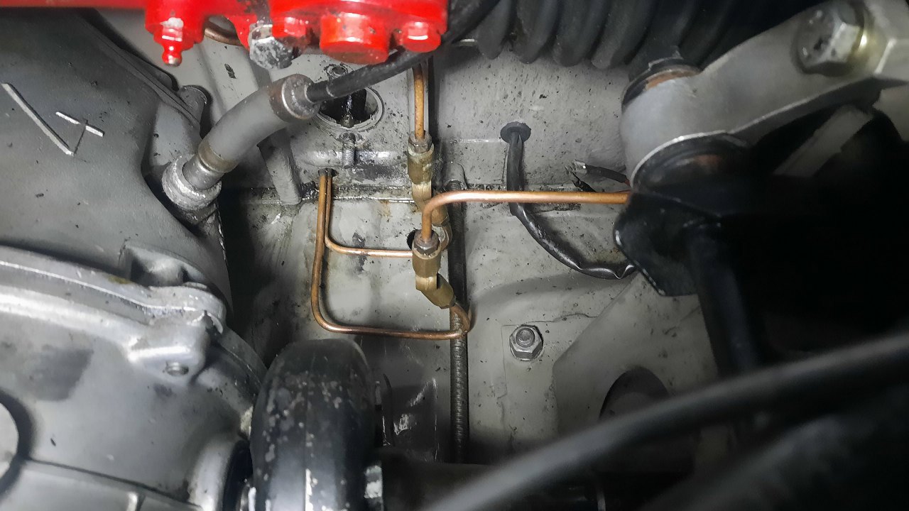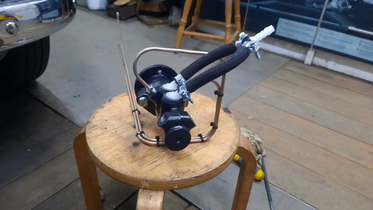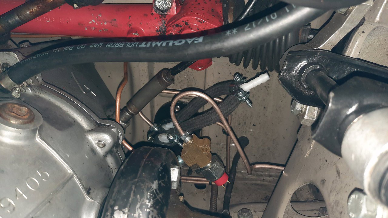Zacząłem od rzeczy najprostszej - zasilania płynem hamulcowym. Do trójnika podepnę oryginalną, skróconą nieco rurkę idącą od zbiorniczka.