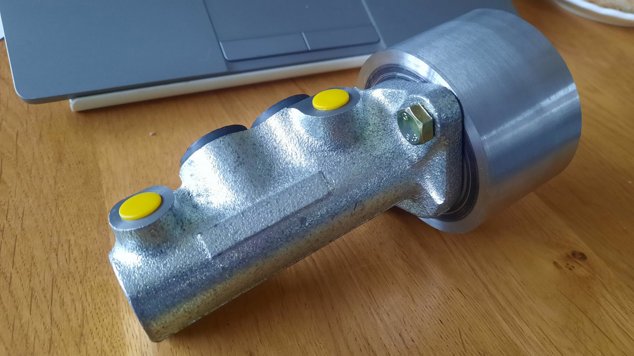 W końcu, po ślęczeniu nad katalogami, znalazłem pompę dość krótką, o średnicy tej samej, co oryginalna. Jest jednak dość długa od płaszczyzny przylegania w stronę pedału, co wymusiło wymyślenie dość sporego adaptera. Kupiłem taką pompę na próbę, a jak okazała się rokująca nadzieje na wpasowanie, zacząłem toczyć adapter. Adapter powstał z walca o średnicy 80mm. Wnętrze jest wytoczone z pasowaniem pod pompę, pompa mocowana jest dwiema śrubami M8.