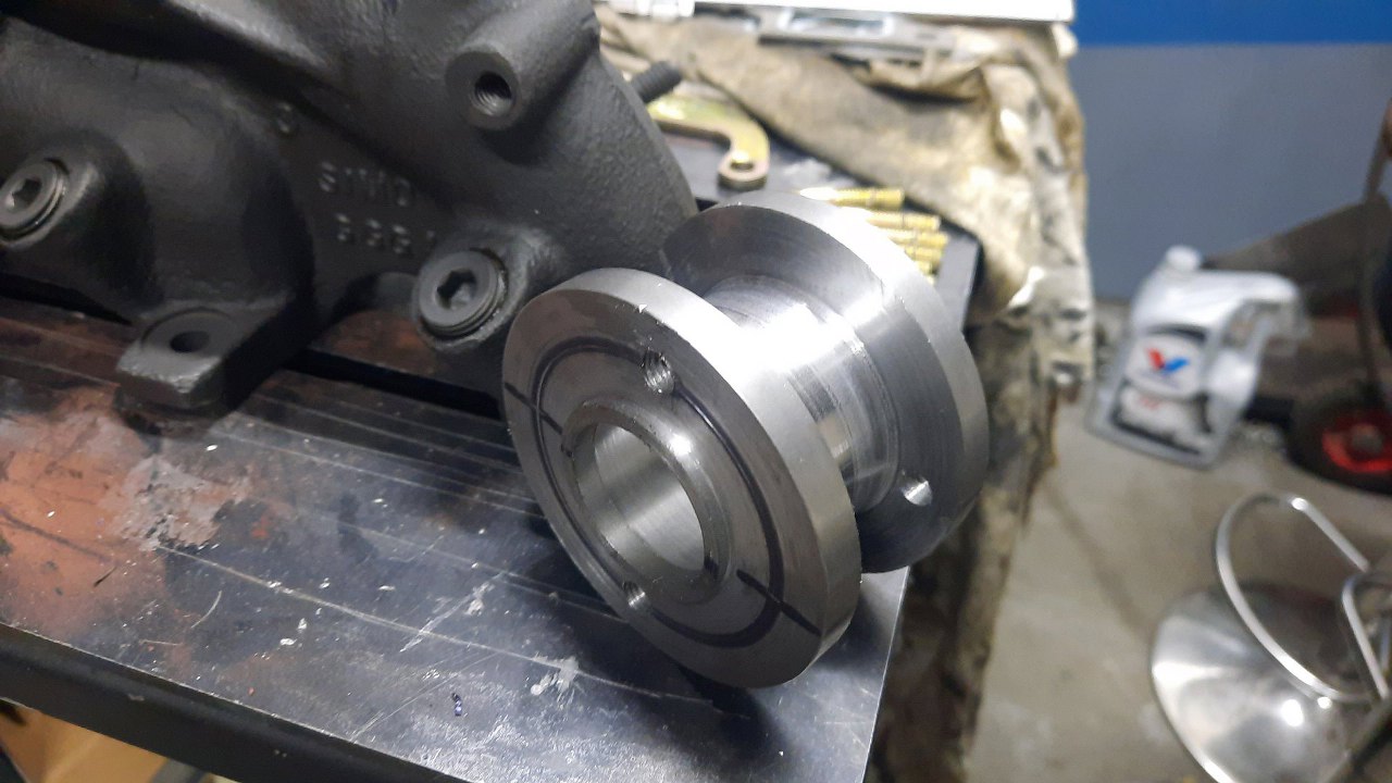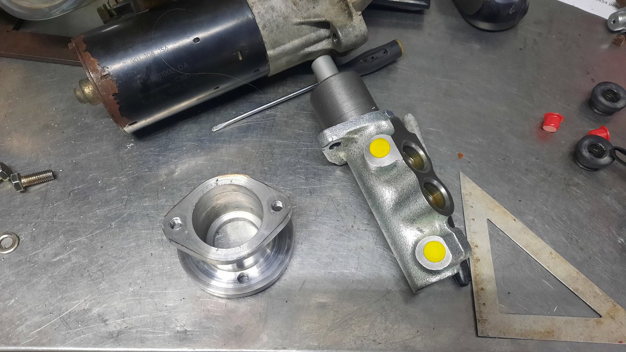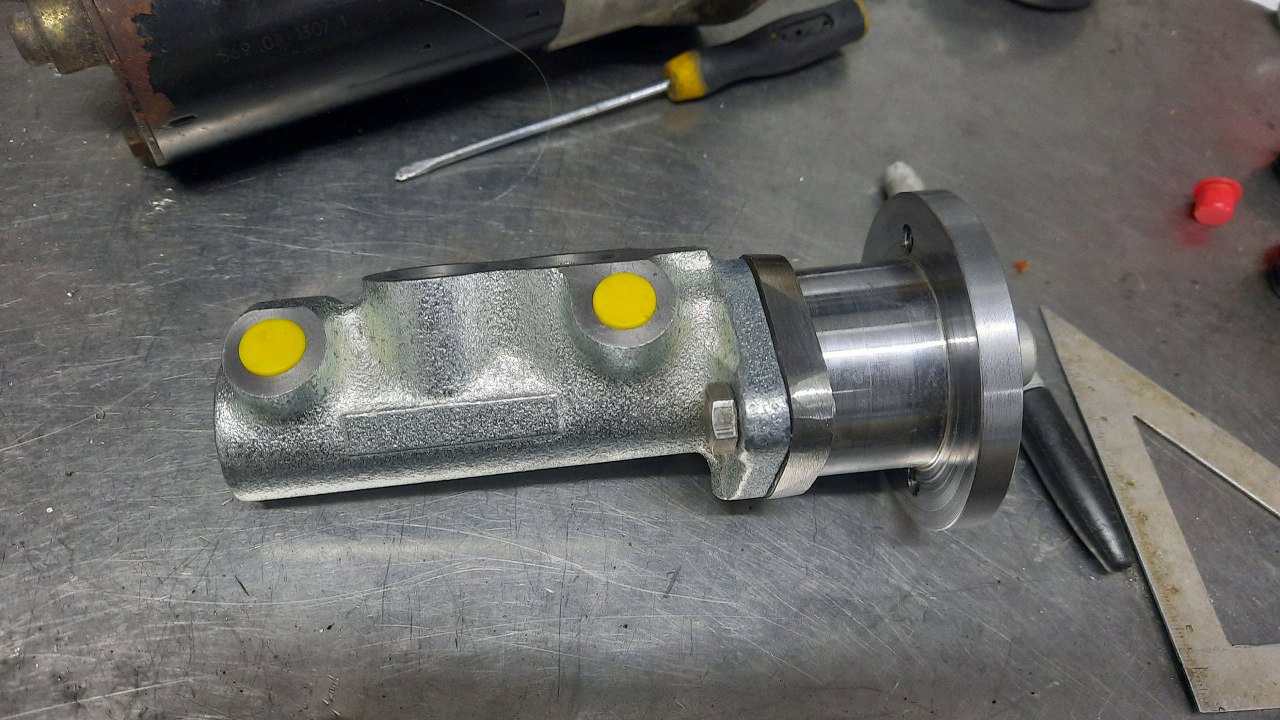 Z drugiej strony zostały 4mm grubości adaptera. DOdatkowo wytoczyłem kołnierz, któy ma wycentrować adapter w otworze w karoserii. Na tym etapie jeszcze nie ma tu otworów z gwintem na śruby mocujące adapter do karoserii, ale planuję wykorzystać stare otwory mocujące oryginalną pompę hamulcową, żeby nic nie zmieniać w karoserii.