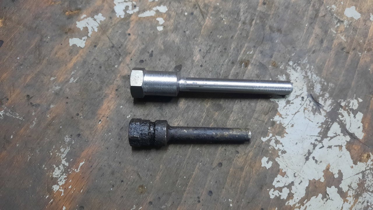 Wytoczyłem więc właściwej długości. Co ciekawe, standardowe gwinty calowe o rozmiarze 3/8" to dla UNC 16 zwojów na cal, a dla UNF - 24 zwoje na cal. Tu musi być gwint 3/8" 20 zwojów na cal... Jeden jedyny gwint w tym rozmiarze, któy znam. Specjalnie po to mam zachomikowany gwintownik.