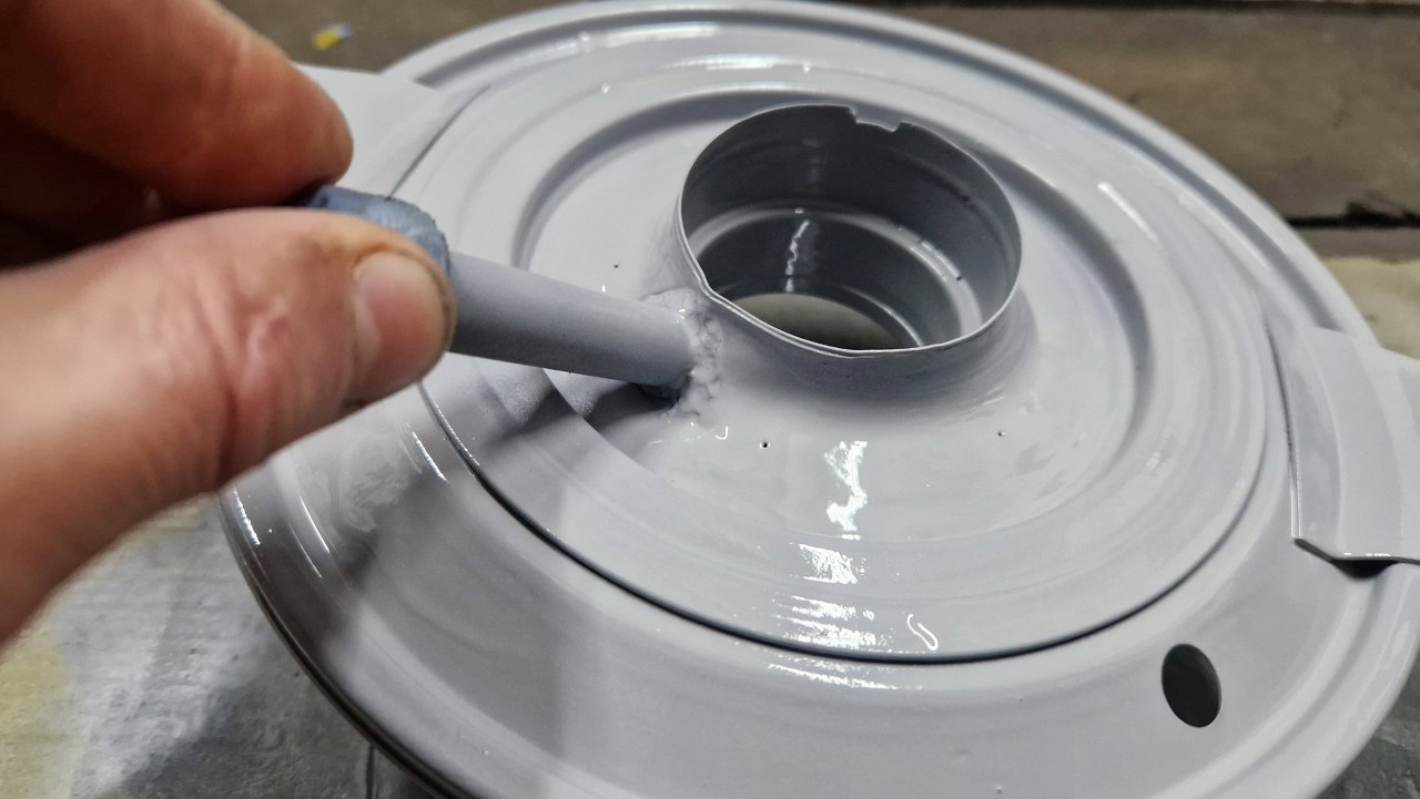 Zapomniałem wcześniej zrobić zdjęcie - od spodu podstawki filtra jest rurka do odmy. Przeciekała, dlatego po szkiełkowaniu a przed malowaniem została pospawana TIGiem.