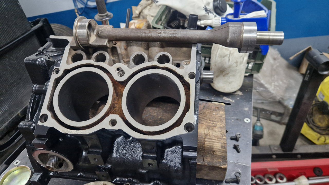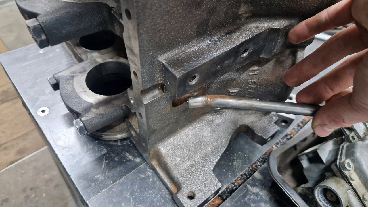 Blok póki co nie był jeszcze planowany, bo nie wiedziałem o ile, jeśli w ogóle. Po powrocie z tulejowania i szlifu wału wybiłem rurkę bagnetu oleju. Potem poskładałem wał i tłoki i zmierzyłem o ile tłok jest poniżej poziomu bloku. Po policzeniu wszystkiego wysżło na to, że można spokojnie splanować blok o 0,9mm, dzięki czemu zwiększy się stopień sprężania silnika.