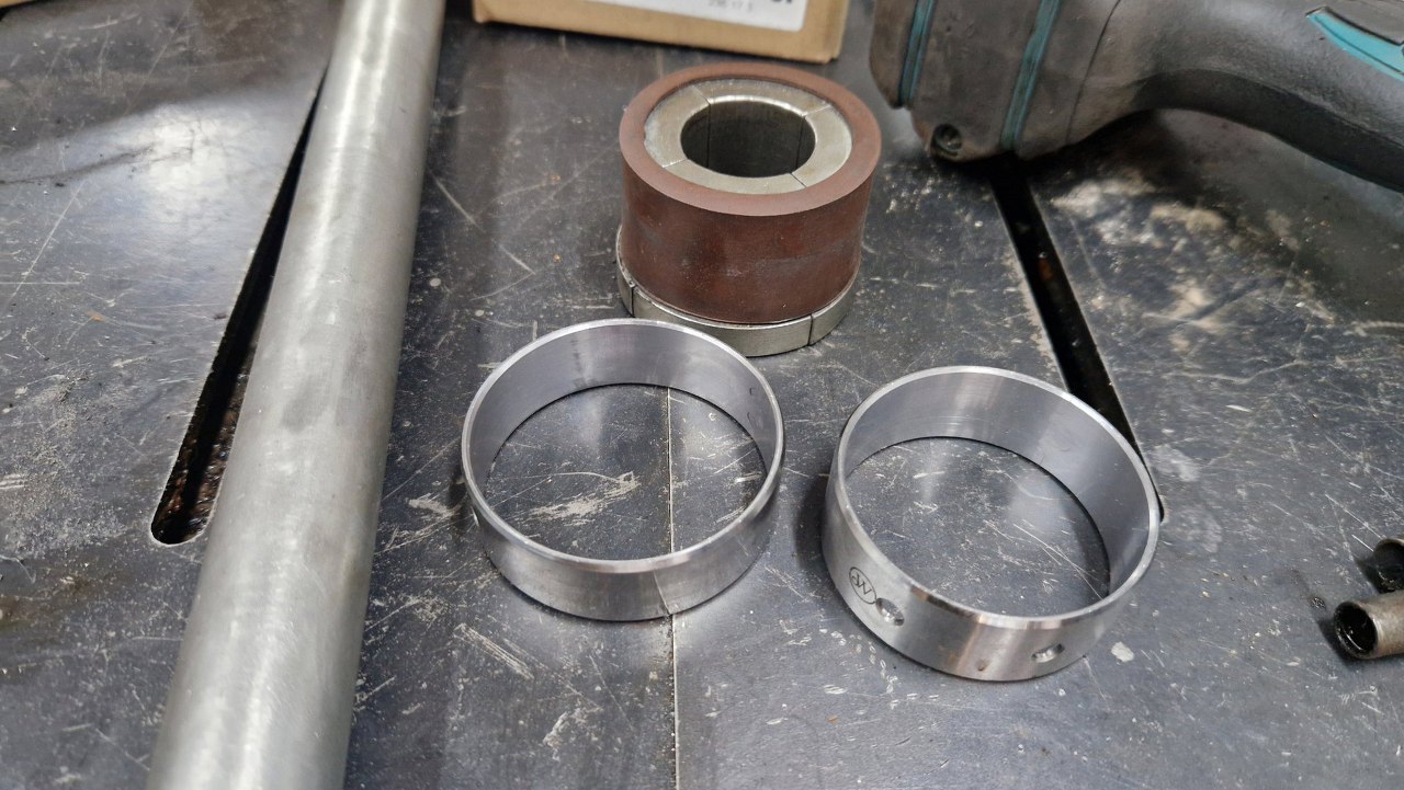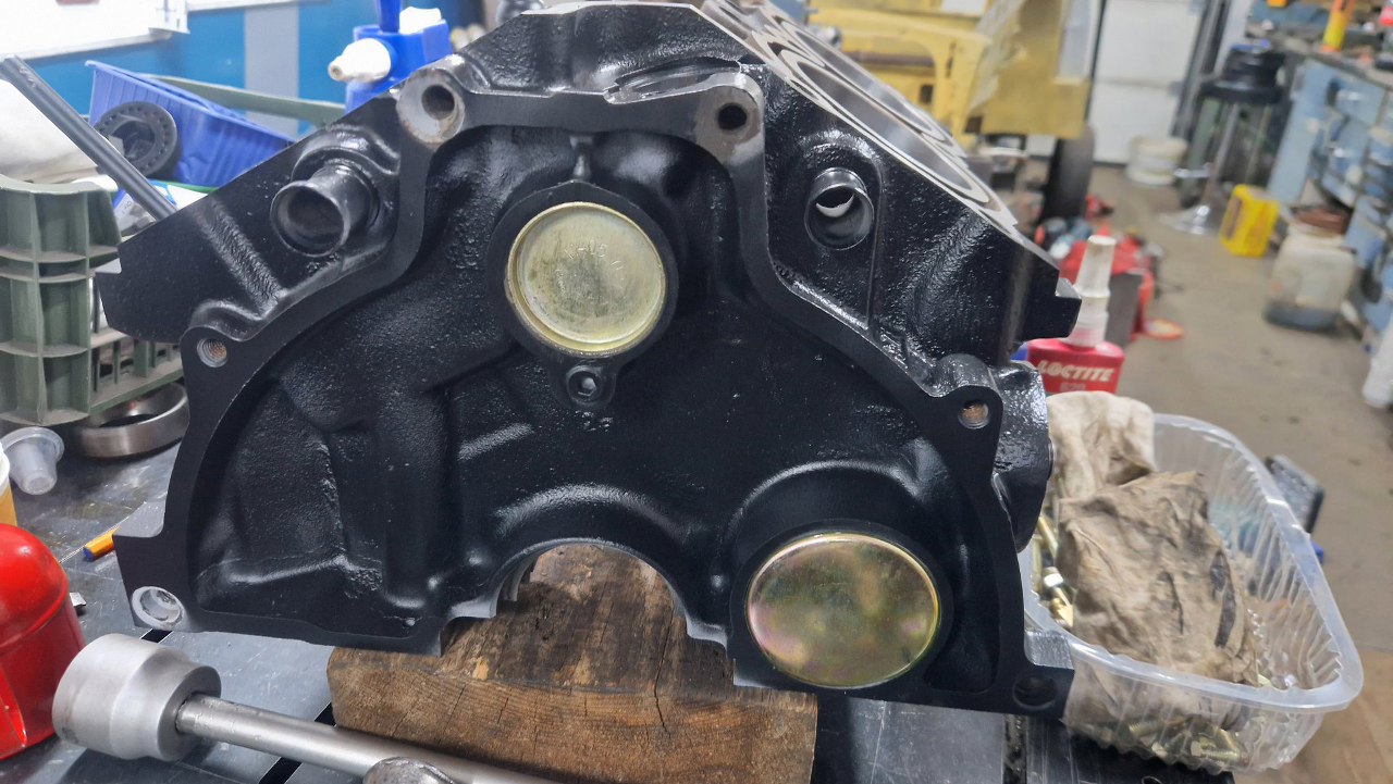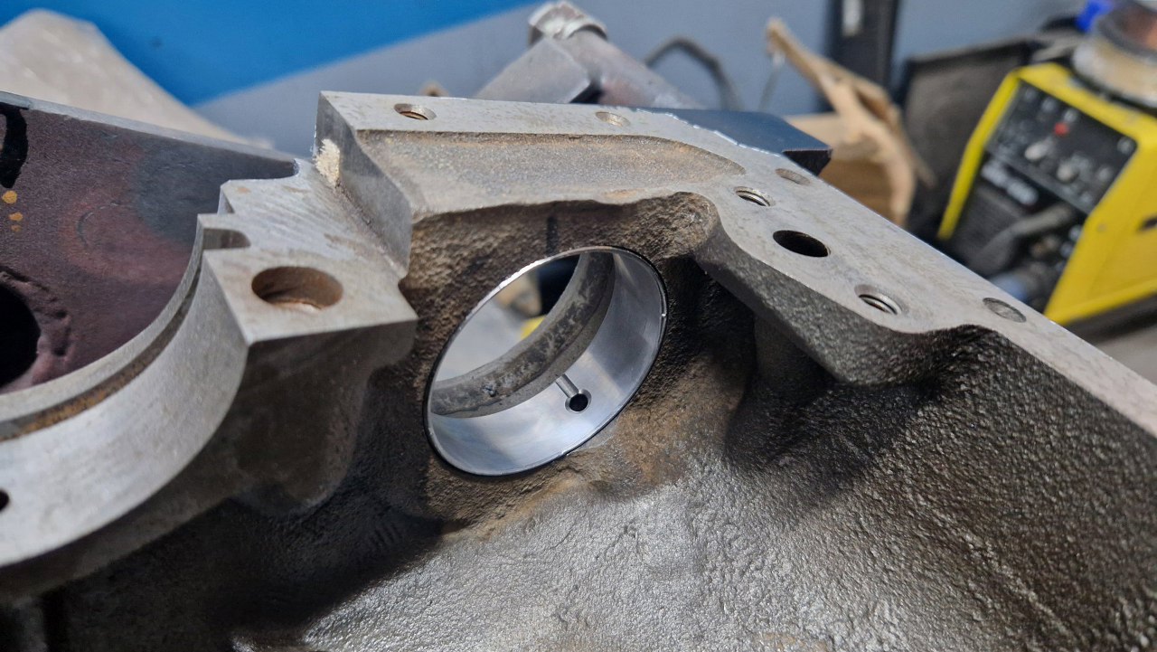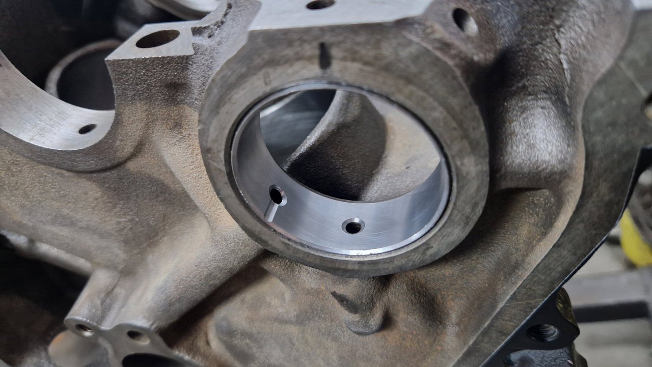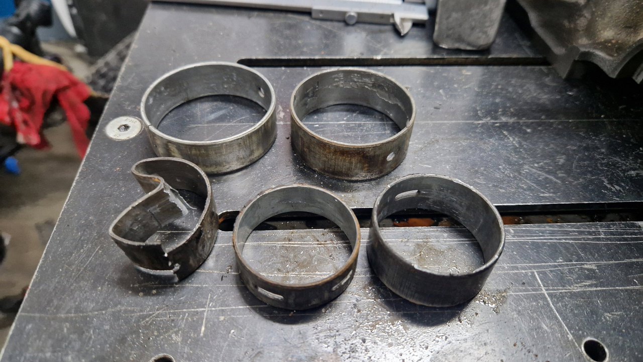 Teraz zdejmuję blok ze stojaka, żeby mieć dostęp do otworów na wałki i przygotowuję nowe panewki. Tu panewki wałka wyrównoważającego.