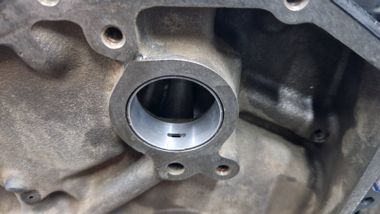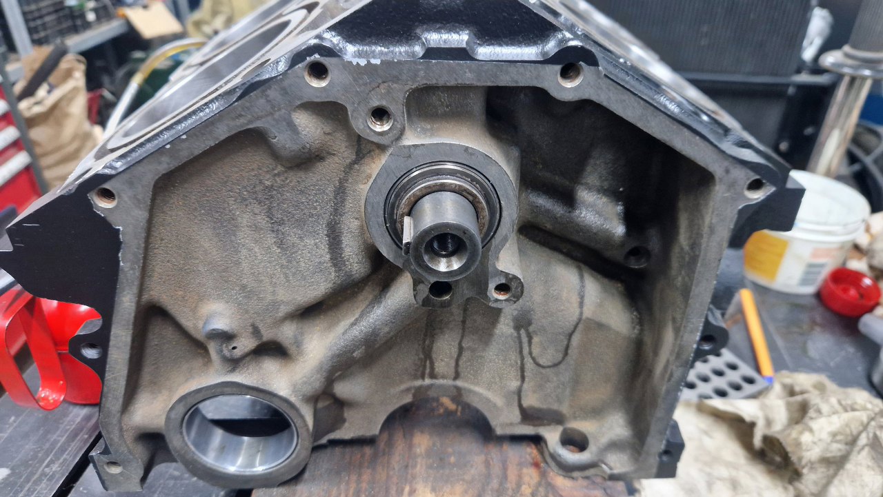 Po planowaniu płaszczyzn pod głowice blok muszę dokładnie wymyć i pomalować. Zaczynam od wybicia panewek wałków - balansu i rozrządu. Tu widać, że złuszczanie panewek już się zaczęło.