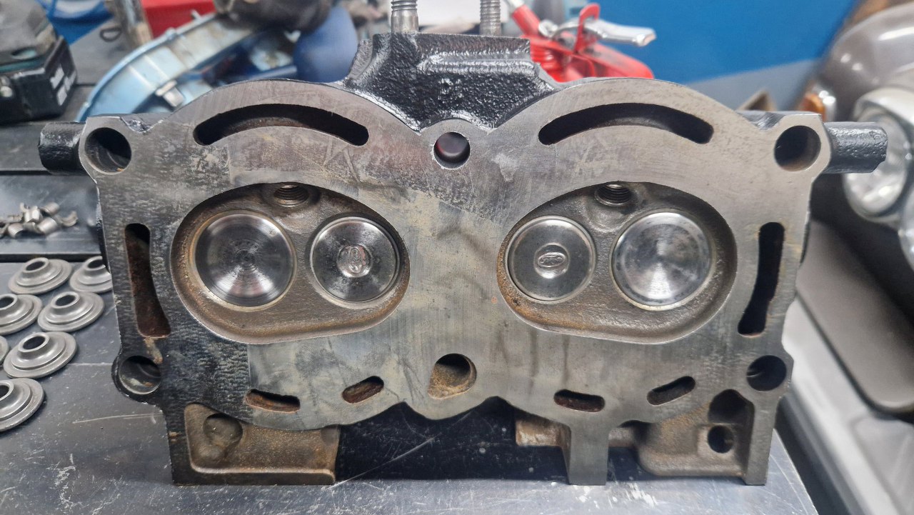 Po posmarowaniu olejem trzonków zaworów, zawory wsunąłem na ich miejsca. Ponieważ wszystkie gniazda i zawory były szlifowane, to nie ma znaczenia gdzie który trafi.