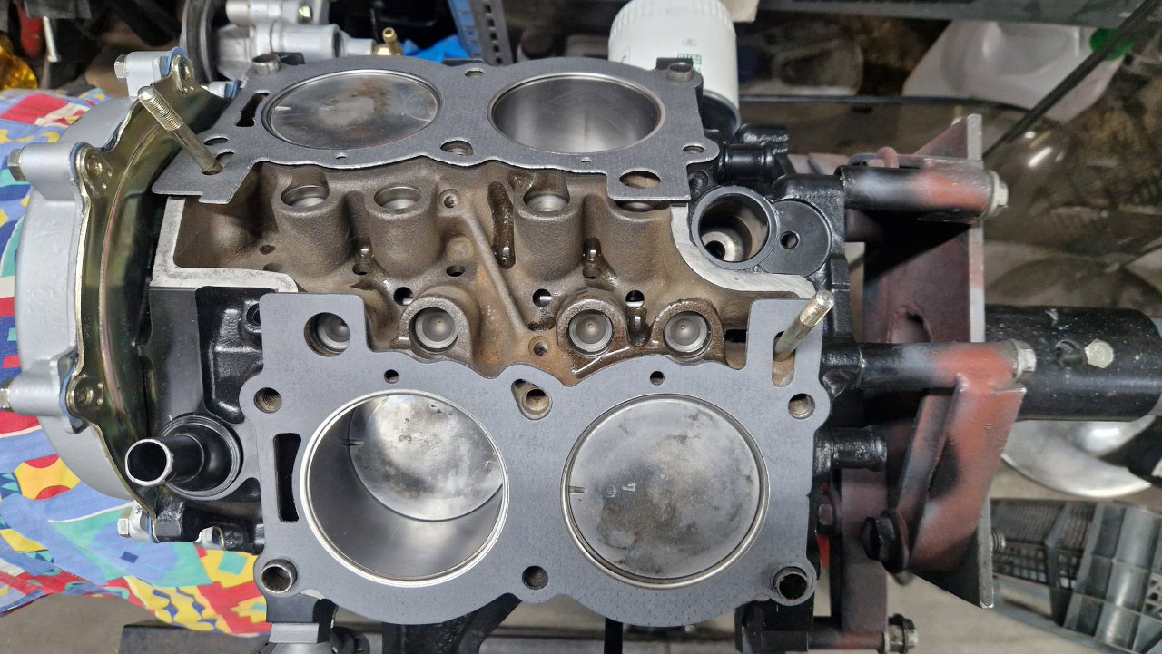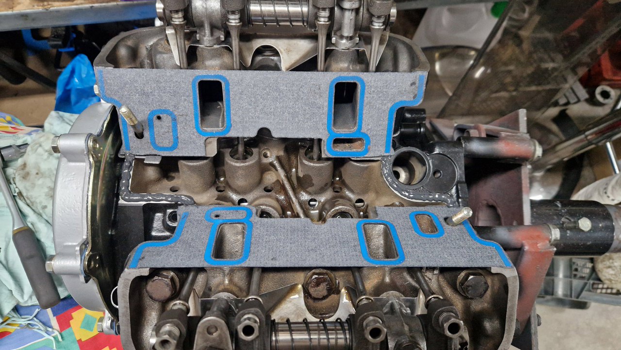 Położyłem na bloku uszczelki. Są lewa i prawa. W tym wczesnym silniku V4 jest odwrócony kierunek przepływu cieczy przez blok, dlatego duże otwory w uszczelkach są z przodu, a nie z tyłu. Różni się też kolektor dolotowy kanałem wodnym.