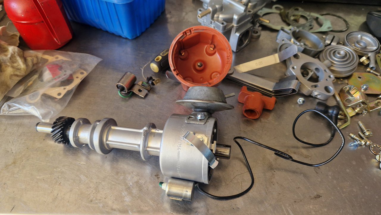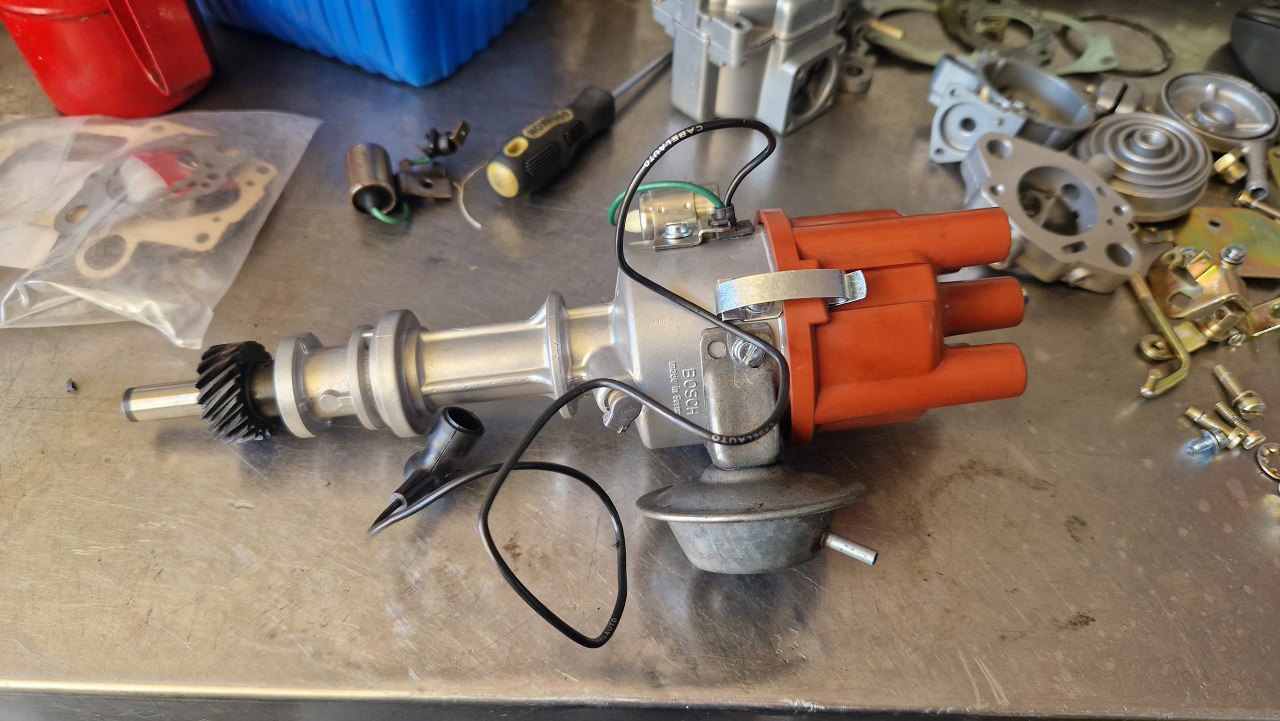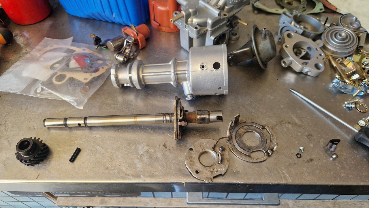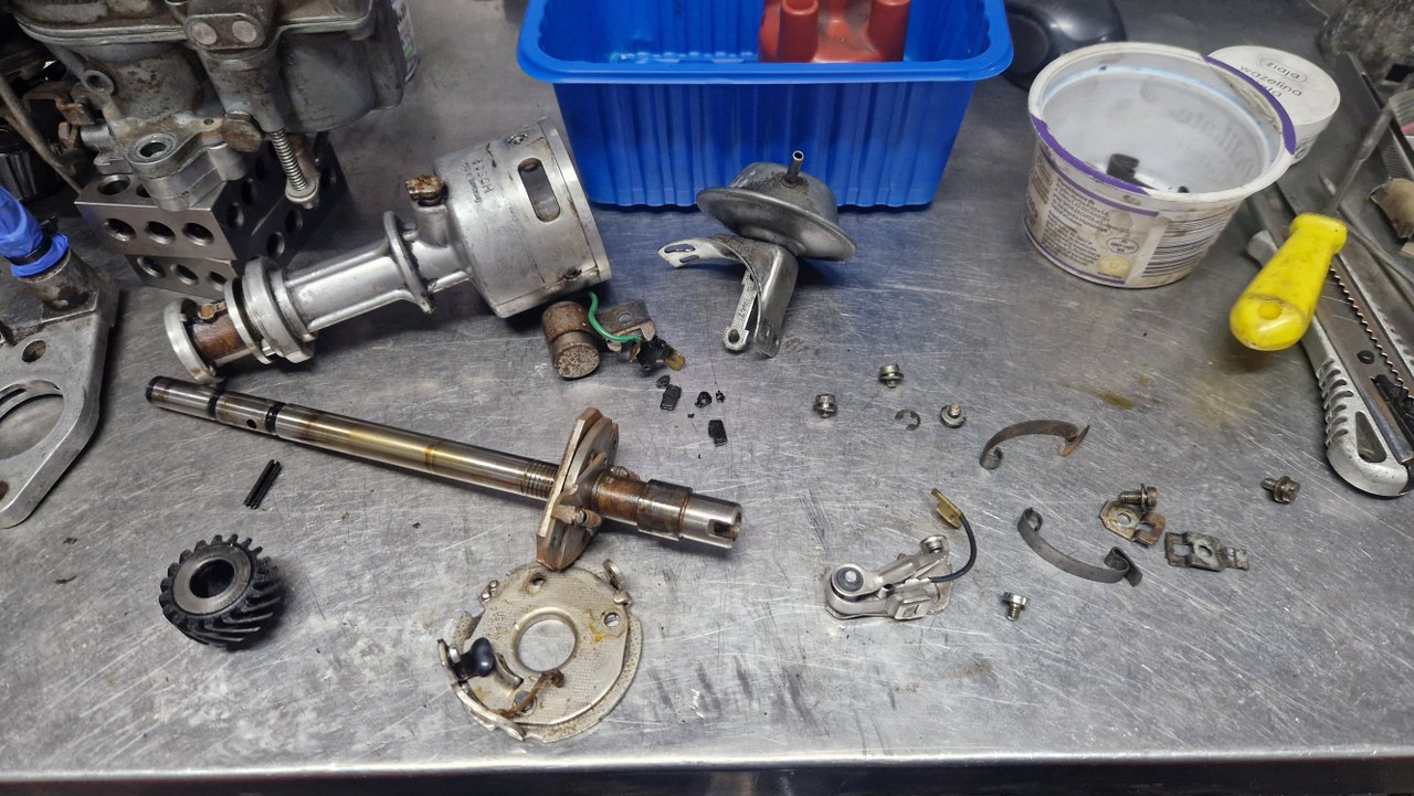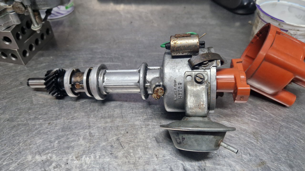 Zaczynam od rozłożenia wszystkiego. Aparat zapłonowy jeszcze starszego typu, z klapką i miejscem na kapnięcie olejem do korpusu (widoczne po lewej od napisu BOSCH).