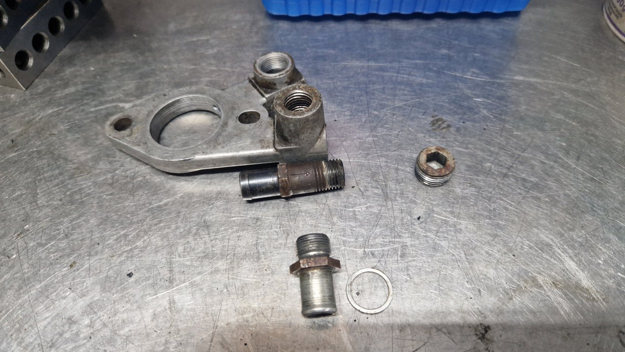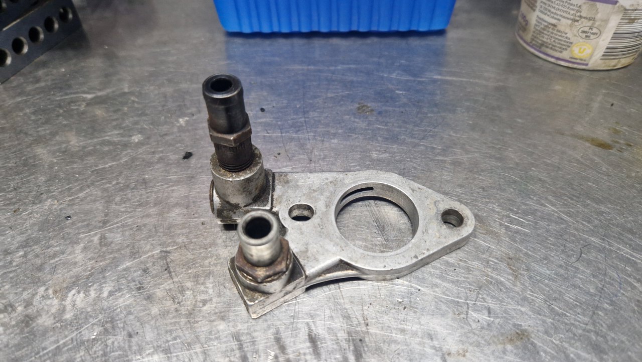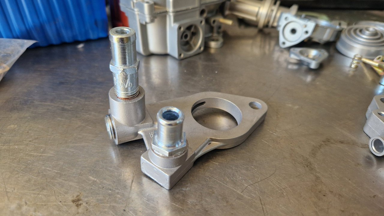 Pora na podstawkę gaźnika. Stąd brane jest podciśnienie do serwa hamulcowego (bliższy króciec) i do odmy (ten wyższy).