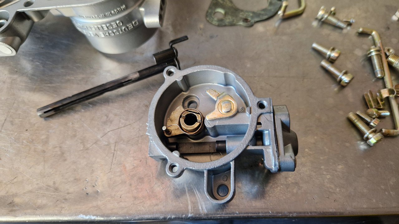 Wyjąłem klapkę i ośkę ssania i odkręciłem obudowę mechanizmu od pokrywy gaźnika.
