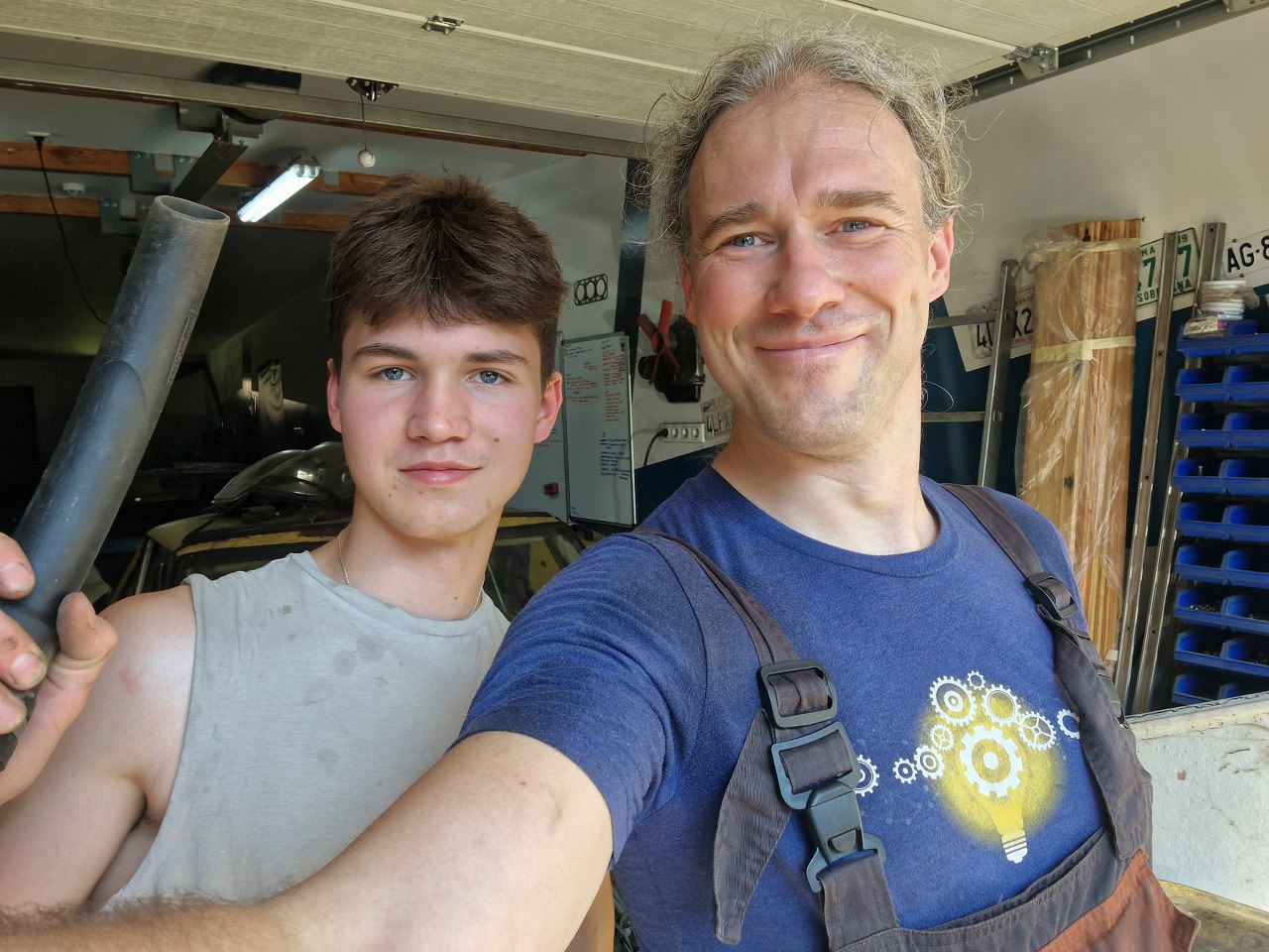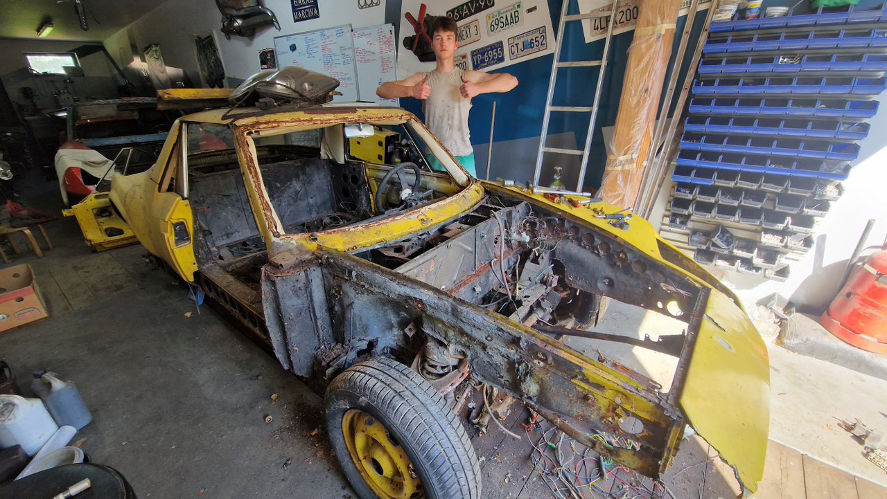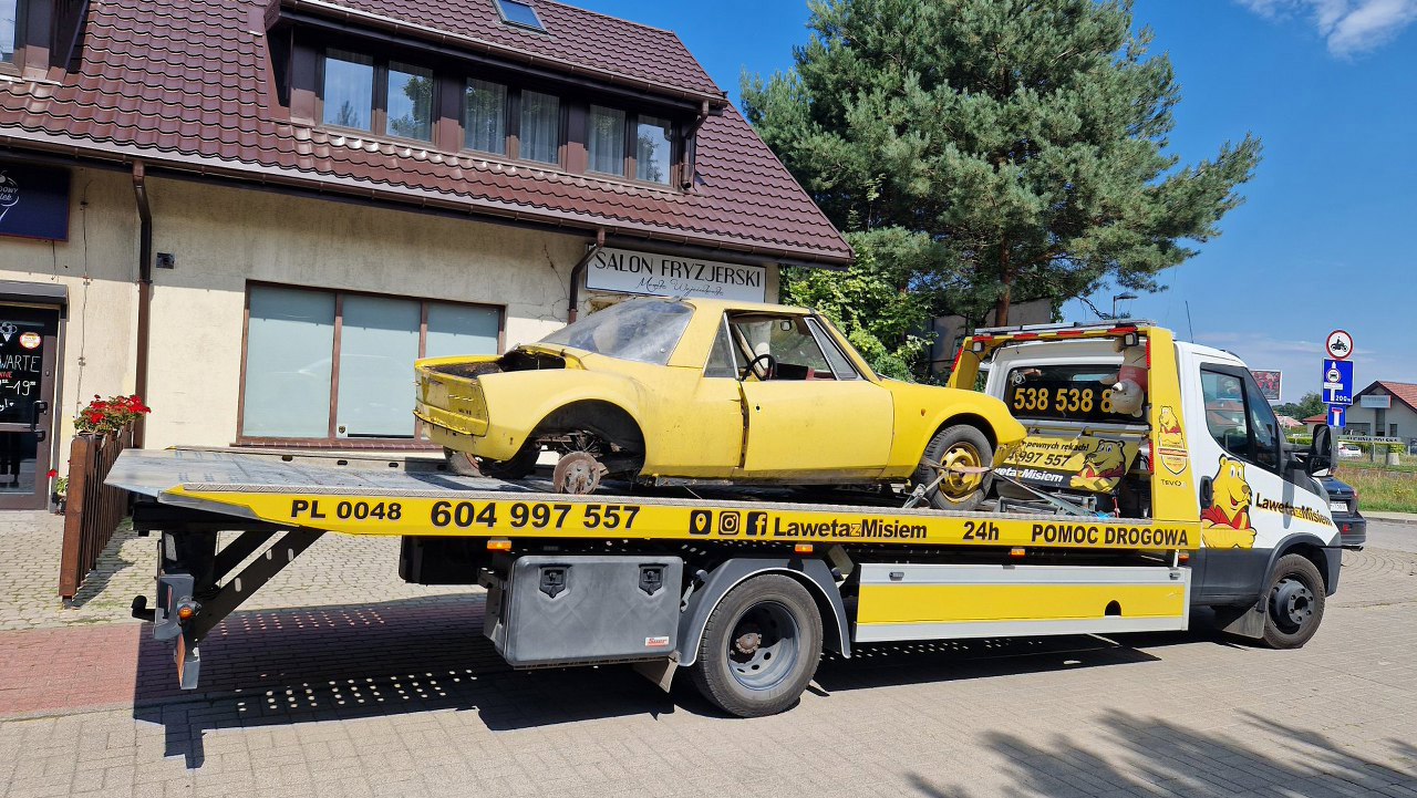 Nieco wcześniej wpadliśmy tam z Maćkiem, żeby posprzątać samochód. Wywaliliśmy śmieci ze środka, zabraliśmy części luzem. Potem chłopaki od lawety z misiem przywieźli strucla. Tak, koła nie było.