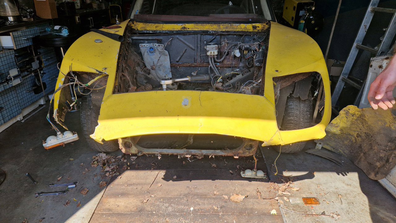 No i zaczęliśmy rozkładanie samochodu, bo przechowywanie go w całości nie ma sensu - raz, że żona narzekałąby na zajęte miejsce, dwa, że i ja bym narzekał, trzy, zdatnych do użycia części jest na tyle niedużo, że zajmą mniej miejsca luzem. Zdjęliśmy pas przedni i lampy, a potem maskę.