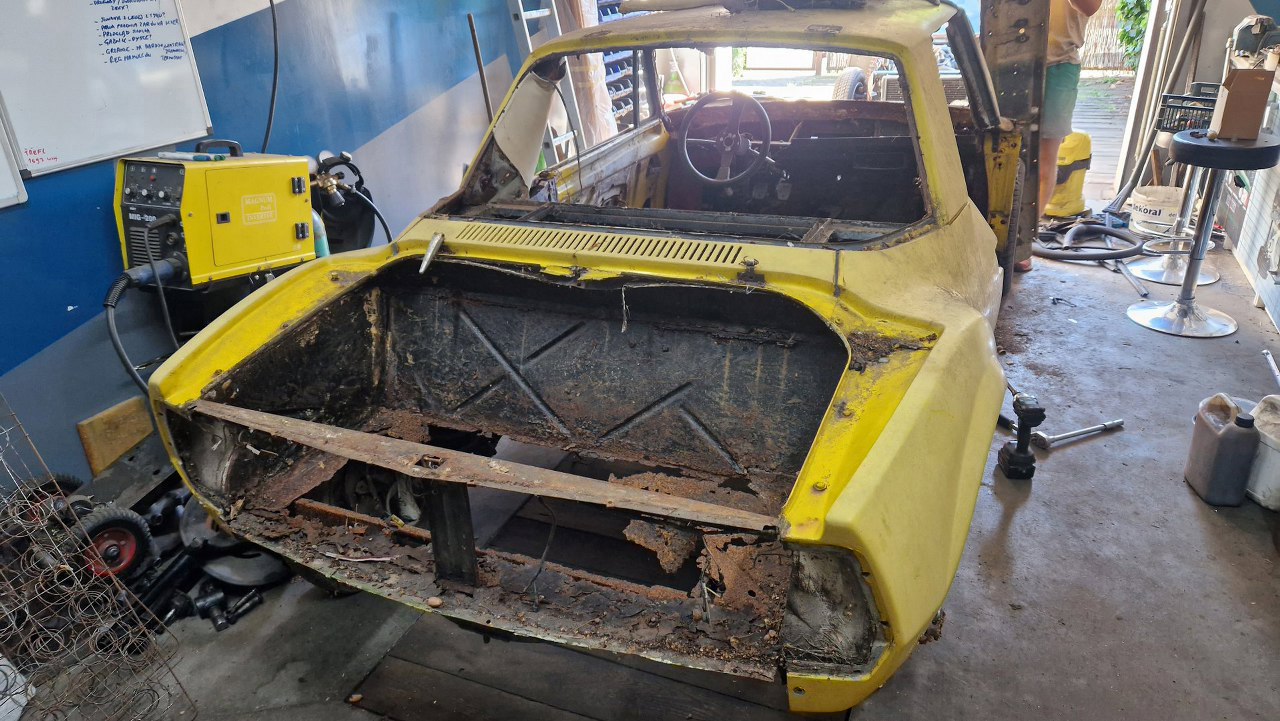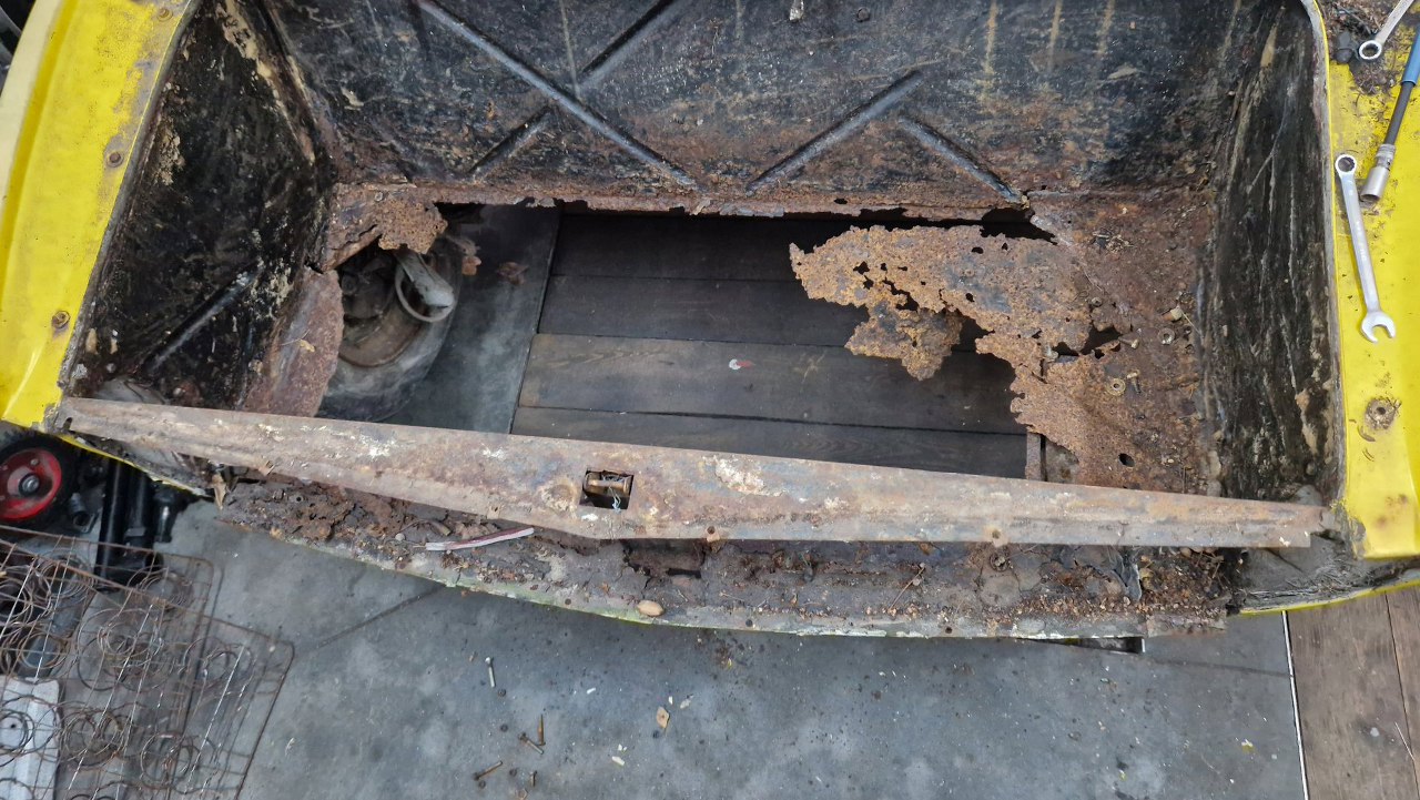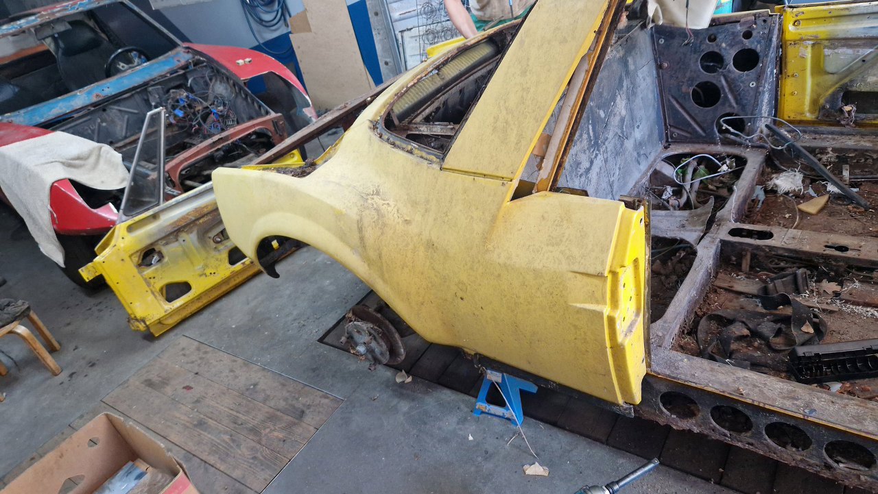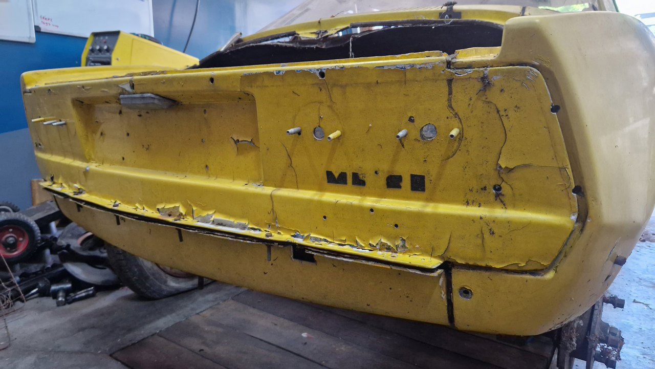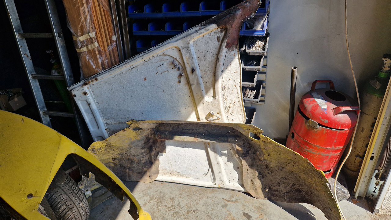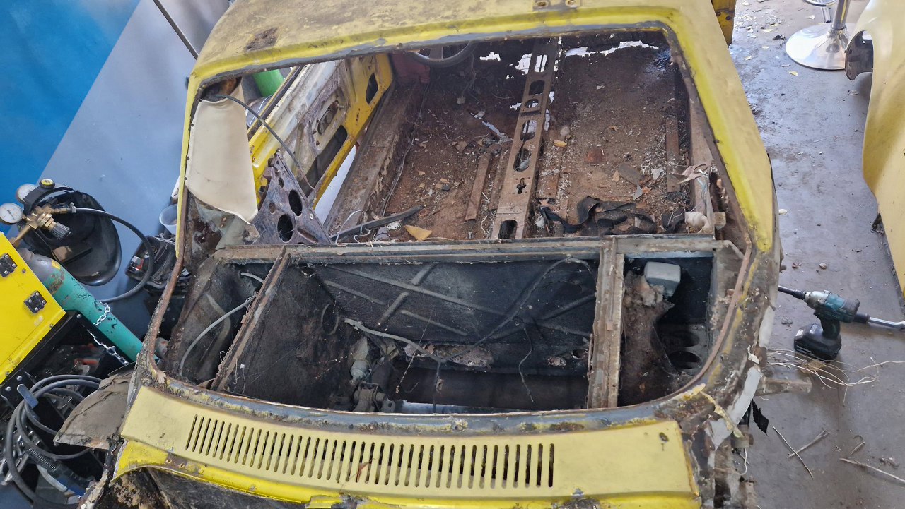 Rozkładanie dość szybko idzie. A co ciekawe, bardzo mało śrub się urywa. Podłoga bagażnika już nie istnieje. Zdjęliśmy też tylną szybę. Tu jest szklana, w czerwonej, wczesnym modelu powinna być z plexi. W żółtej w środku znaleźliśmy metalową ramkę na tą szybę z plexi, więc można by próbować zrobić oryginał, ale trzeba by zrobić wygięte plexi, a tego chyba nie umiemy. Dlatego będzie kundelek ze szklaną szybą. Tu też widać, jak tylny pas zachodzi szeroko na błotniki.